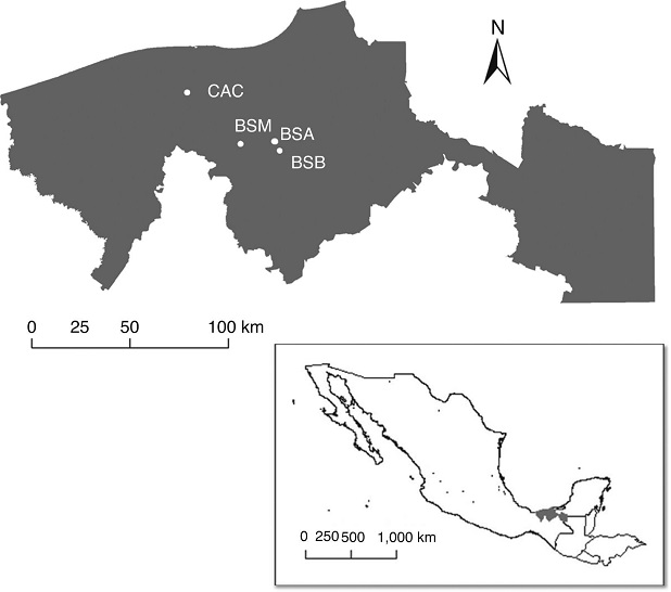 Bosque secundario mediano (BSM): se ubica a 17°99'02" N, 92°97'47" O, en la periferia oeste de la ciudad de Villahermosa, Tabasco. Cuenta con una superficie de 24 ha con fragmentos de bosque secundario mediano, bosque espinoso de tinto (Haematoxylum campechianum ) y zonas acuáticas (Ascencio-Rivera y Maldonado-Mares, 2002; Sandoval, 2011). Este bosque secundario es comúnmente utilizado para la investigación científica y se ubica en el campus de la División Académica de Ciencias Biológicas de la Universidad Juárez Autónoma de Tabasco (UJAT). La altura promedio del dosel es de 7.8 m y la cobertura de 82.2%. El sotobosque tiene una altura promedio de 140 cm, con mayor porcentaje de cobertura de sotobosque en los estratos 1 (45%) y 2 (38%). El 50% del suelo de este bosque secundario está cubierto por herbáceas.