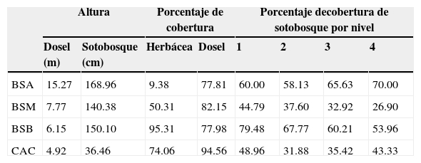 Para conocer la estructura de la vegetación, en cada bosque secundario fueron establecidos 4 cuadros de 30 x 30 m, en los que se estimaron 8 variables: porcentaje de cobertura de dosel con el uso de un densiómetro cóncavo, altura de dosel y altura de sotobosque mediante una aproximación con una barra medidora de 15 m, porcentaje de cobertura de plantas herbáceas calculado visualmente en cada cuadro y cobertura de sotobosque con el uso de una regla de cobertura para calcular el porcentaje de obstrucción visual en 4 niveles, nivel 1: de 0 a 50cm, nivel 2: 51 a 100 cm, nivel 3: 101 a 150 cm y nivel 4: 151 a 200 cm de acuerdo con el método propuesto por Griffith y Youtie (1988).