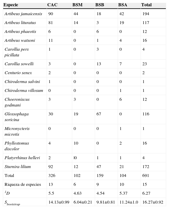 Se capturaron un total de 691 murciélagos frugívoros, descartando 10 recapturas. Se identificaron 15 especies de murciélagos frugívoros, que representan una riqueza ligeramente menor respecto de la riqueza esperada mediante bootstrap (S bootstrap = 16.3 ± ES 0.9). El valor de diversidad verdadera total de nuestro estudio fue de 1 D = 6.3. Las especies más abundantes en el estudio fueron Artibeus jamaicensis (A. jamaicensis) y Sturnira lilium (S. lilium) , que representaron el 28 y 25% del total de capturas, respectivamente. En el CAC se capturaron 326 individuos de 13 especies, una menos que las estimadas por bootstrap 14.1 ± ES 0.9. En BSB capturamos 159 individuos de 9 especies, la riqueza registrada está dentro del rango de riqueza esperada (Sbootstrap= 9.8 ± ES 0.8). Se capturaron 104 individuos de 10 especies en BSA, riqueza cercana a la esperada (Sbootstrap= 11.2 ± ES 1.0). En BSM se capturaron 102 individuos de 6 especies, que coinciden con la riqueza esperada (Sbootstrap= 6 ± ES 0.2). La diversidad verdadera fue similar entre bosques secundarios. En CAC se registró el valor más alto de diversidad verdadera (1 D = 5.5), seguida de la BSA con 1 D = 5.4. Los bosques secundarios menos diversos fueron BSM y BSB, con 1 D = 4.6 y 1 D= 4.5 (tabla 2).