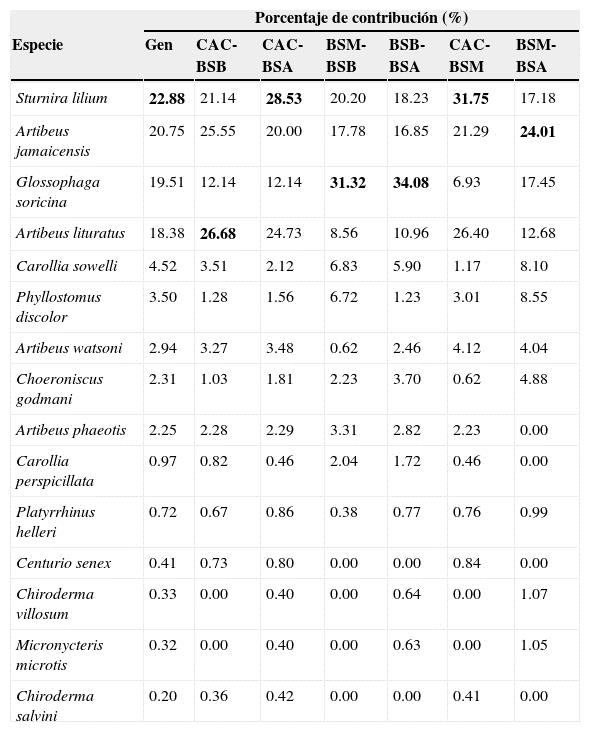 El grado de disimilitud en la composición de especies de murciélagos frugívoros entre bosques secundarios fue determinado mediante análisis de similitudes (ANOSIM; Clarke, 1993), el cual ofrece un valor de R entre 0 (máxima similitud) y 1 (máxima disimilitud) y un valor de p que menor a 0.05 indica que los resultados del análisis son confiables. Para estimar el porcentaje de contribución de cada especie a estas disimilitudes fue calculado el porcentaje de similitudes (SIMPER; Clarke, 1993). Para las comparaciones en ANOSIM y SIMPER se elaboraron matrices de similitud/distancia basadas en abundancias y en presencia-ausencia, utilizando el índice de Bray-Curtis (Hammer, 2012). Estos análisis se realizaron en el programa PAlaeontological STatistics (PAST) versión 2.17c (Hammer, Harper y Ryan, 2001).
