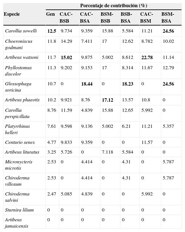 Porcentaje de contribución por especie a las disimilitudes entre 4 bosques secundarios de Tabasco, México, obtenidos mediante el porcentaje de similitudes (SIMPER), datos basados en abundancia.