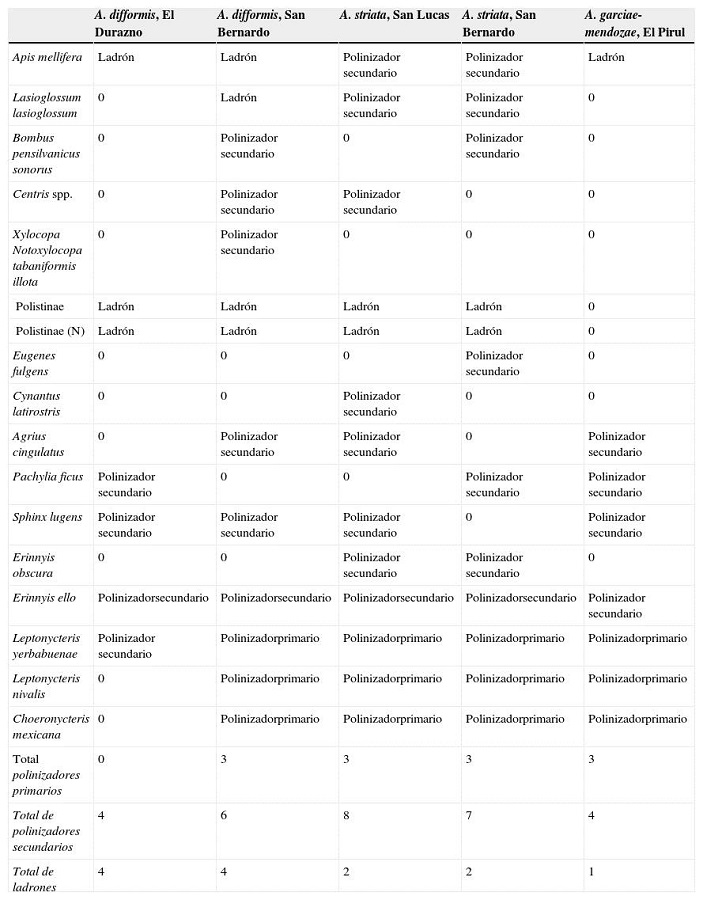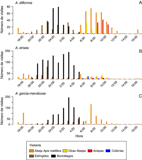 En el presente trabajo se analiza con detalle la comunidad de visitantes de las inflorescencias de A. garciae-mendozae , A. striata y A. difformis en la Barranca de Metzitlán, mediante análisis de videograbaciones de noches completas, permitiendo determinar mejor el papel que cumple cada uno de ellos como polinizadores o robadores.