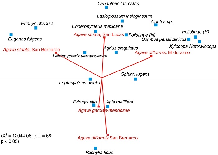De acuerdo con el análisis de correspondencia (fig. 6), algunas especies de visitantes florales tuvieron mayor "afinidad" por una o más inflorescencias. Las especies visitantes que se observan más céntricas en la figura se encontraron en la mayoría de las poblaciones, mientras que los visitantes más lejanos al centro tienen mayor "afinidad" por la población que se encuentre más cercana a su ubicación. Así, quedan cerca del centro las 2 especies de Leptonycteris , A. mellifera y 3 especies de esfíngido, A. cingulatus , E. ello y S. lugens , mientras que se alejan las que solo se encontraron en pocas o en una especie/localidad, especialmente los colibríes, que solo visitaron A. striata . Por otra parte, las abejas y las avispas, a excepción de A. mellifera , se encuentran más cercanas a las A. striata y a la localidad con menor cantidad de visitantes nocturnos, A. difformis en la localidad de El Durazno.