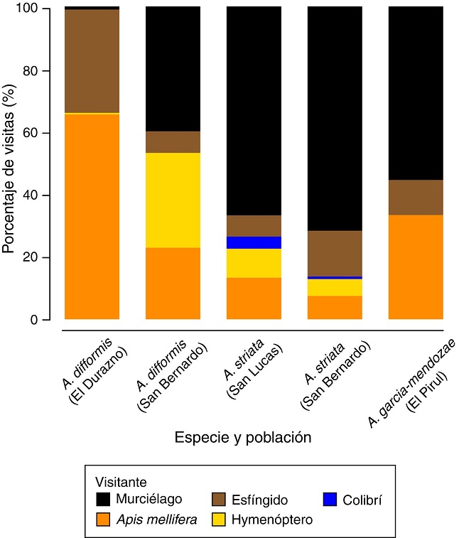 Generalmente, los murciélagos dominan las visitas nocturnas (fig. 2), excepto en la inflorescencia de A. difformis de la población El Durazno, donde son más comunes los esfíngidos (33.1% del total de visitas). Los esfíngidos visitaron todas las inflorescencias estudiadas, representando entre el 6.8 y el 17.1% del total de las visitas. Entre los visitantes diurnos, el más importante es A. mellifera , con porcentajes de visita entre el 7.5 y el 65.6%. L. lasioglossum y diversas avispas también fueron importantes en algunas poblaciones. Otras abejas, como Xylocopa , Bombus y Centris solo se encontraron en algunas inflorescencias, y su contribución a la polinización parece ser actualmente limitada. Los colibríes solo se grabaron en las 2 localidades de A. striata (véase adelante).