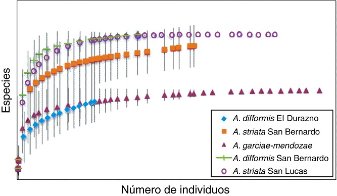 El análisis de rarefacción (fig. 4) muestra que las curvas de acumulación de especies de A. garciae-mendozae y A. difformis en la localidad de El Durazno resultaron más parecidas y menos diversas; se sobreponen sin mostrar grandes diferencias y las curvas alcanzan la asíntota en una diversidad de visitantes florales de 8 especies. La inflorescencia de A. striata en la localidad de San Bernardo es un poco más diversa y se encuentra en un punto muy cercano a la asíntota, que podría llegar a 13 especies de visitantes florales. Las inflorescencias con mayor cantidad de especies de visitantes fueron A. striata en San Lucas y A. difformis en San Bernardo, las cuales no mostraron diferencias entre ellas y llegan rápidamente a la asíntota, con 13 especies en unas 500 visitas.