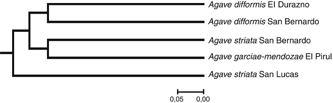 El índice de similitud de Sorensen (fig. 5), calculado sobre la base de los visitantes, mostró que las inflorescencias comparten la mayoría de las especies. La mayor similitud se observó entre las inflorescencias de A. difformis . Las siguientes 2 inflorescencias con visitantes más parecidos fueron A. striata en la localidad de San Bernardo y la inflorescencia de A. garciae-mendozae . La mayor diferencia en los visitantes se observó entre las inflorescencias de A. difformis , A. garciae-mendozae y A. striata en la localidad de San Bernardo, respecto de la inflorescencia de A. striata en la localidad de San Lucas, aunque estas fueron las más cercanas entre sí (3.69 km).