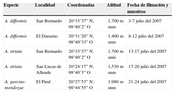 Debido a la capacidad del equipo de video -4 h por cada cassette-, en cada una de las poblaciones (tabla 1) se seleccionó una planta/inflorescencia por especie para ser filmada y que cumpliera con 3 criterios: a) que la inflorescencia se encontrara a la vista de los visitantes; b) que se encontrara en etapa media de floración, y c) que el individuo estuviera sano, por ejemplo, color verde en las hojas centrales, la inflorescencia no tuviera apariencia seca y que tuviera flores funcionales y bien formadas. La única población que presentaba más de una especie fue San Bernardo con A. difformis y A. striata. Se colocó una cámara de video Sony Handycam; night shot-vision nocturna (modelo CCD-TRV318; zoom óptico de 20×, digital de 560×, formato Hi8) por inflorescencia a 1 m de distancia de las flores, cambiando las baterías y la cinta cada 4 h hasta completar 24 h. En el caso de la localidad de San Bernardo (con presencia de 2 especies de A. difformis y A. striata ), se usaron cámaras Sony Handycam formato miniDV (modelo DCR-HC21; zoom óptico 12×; digital 480×), en las que el cambio de batería y cinta se realizó cada 1:30 h hasta completar las 24 h. Cada inflorescencia se filmó en días distintos.