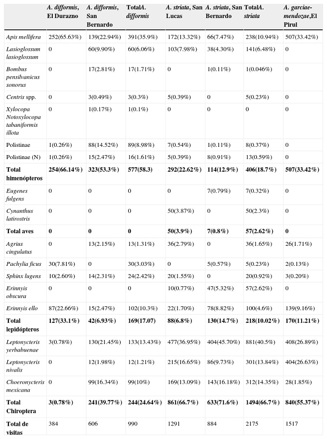 En la tabla 2 se resumen los datos de visitantes por especie y localidad. A partir del análisis de composición de los visitantes florales de las distintas especies observadas, se determinaron 3 principales grupos de visitantes de las inflorescencias de Agave spp.: murciélagos, aves e insectos. Dentro de estos grupos se identificaron 3 especies de murciélagos Phyllostomidae (C. mexicana , L. nivalis y L. yerbabuenae ), 2 especies de colibríes (Eugenes fulgens y Cyanthus latirostris ), 5 de esfíngidos (Agrius cingulatus , Pachylia ficus , Sphinx lugens , Erinnyis obscura y E. ello ) y 8 de himenópteros (Lasioglossum lasioglossum , Bombus pensilvanicus , Centris spp., Xylocopa Notoxylocopa , así como miembros de la tribu Polistinae) (tabla 2).