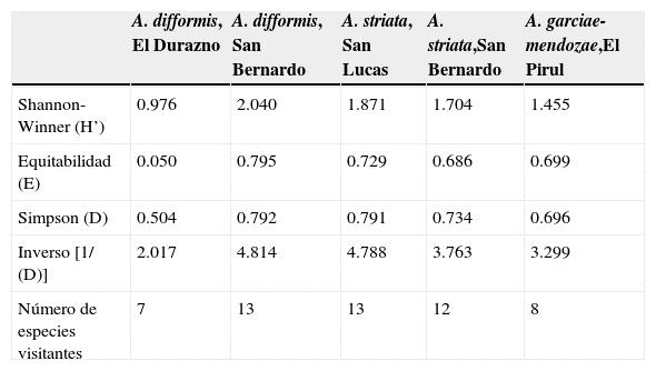 El índice Shannon-Wiener (tabla 3) muestra que la inflorescencia con mayor diversidad de visitantes fue A. difformis en San Bernardo, donde se registraron 13 especies de visitantes. A. striata en San Lucas también fue visitada por 13 especies de animales. La menor diversidad se registró en la localidad El Durazno en A. difformis , con 7 especies, y donde claramente dominaron las visitas de A. mellifera y el esfíngido E. ello (tabla 2). Según el índice de Simpson (tabla 3), el valor más elevado de diversidad fue de A. difformis en San Bernardo, que de nuevo fue muy similar al obtenido para A. striata en la localidad de San Lucas. El valor más bajo se registró en A. difformis en la localidad de El Durazno. Una forma más intuitiva de interpretar el índice de Simpson es usando el valor 1/ (1-índice de Simpson), que se puede entender como el "número de especies efectivas". Las inflorescencias de A. difformis en San Bernardo y A. striata en San Lucas presentaron un número de "especies efectivas" cercano a 5, aunque en total eran 13 especies visitantes. Para la inflorescencia de A. difformis en la comunidad de El Durazno, el número de especies efectivas fue solo de 2.