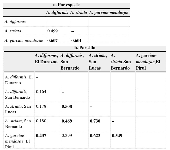 El índice de especificidad propuesto por Kay y Schemske (2003) (tabla 4a) a nivel especie indica que A. garciae-mendozae comparte en mayor grado las especies visitantes con A. difformis , seguido de manera muy cercana por A. striata , mientras que la mayor diferencia se encontró entre las especies A. difformis y A. striata . Sin embargo, el mismo índice aplicado para comparar cada una de las localidades (tabla 4b) muestra que la mayor sobreposición se encuentra entre los 2 sitios de la especie A. striata . La sobreposición de A. striata en San Lucas respecto de A. garciae-mendozae y la sobreposición entre esta última con A. striata en la localidad de San Bernardo son altas. El grado de similitud más bajo resultó entre las inflorescencias que corresponden a la misma especie en A. difformis en El Durazno y San Bernardo, y entre A. difformis en El Durazno y A. striata en San Lucas, y entre A. difformis en El Durazno y A. striata en San Bernardo.