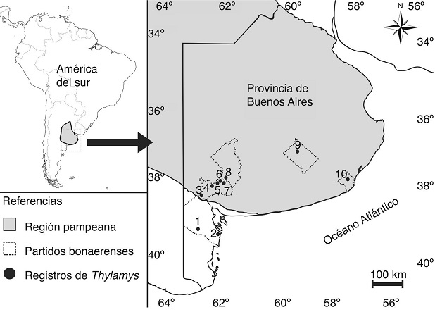 Al igual que en otras áreas de su distribución, una parte de las especies de Thylamys encontradas en Argentina presentan asociación con ambientes áridos (Albanese y Ojeda, 2012). Sin embargo, existen varios registros de estas comadrejas en otro tipo de ambientes, como es el caso de la región pampeana. Esta región se caracteriza por presentar extensas llanuras cubiertas por pastizales, solo interrumpidos por 2 sistemas de sierras de baja altura (Viglizzo, Frank y Carreño, 2006). Los escasos registros de Thylamys para la región corresponden a ejemplares capturados en ambientes serranos, cuya entidad taxonómica es tema de debate. Martín (2009), basándose en las características craneales indica que estos individuos pertenecen a una nueva especie endémica, Thylamys fenestrae , mientras que estudios posteriores basados en técnicas moleculares consideran que estas diferencias no serían definitivas, por lo que sugieren que fenestrae representaría una subespecie de Thylamys pallidior (T. pallidior) (Giarla et al., 2010; Palma et al., 2014).