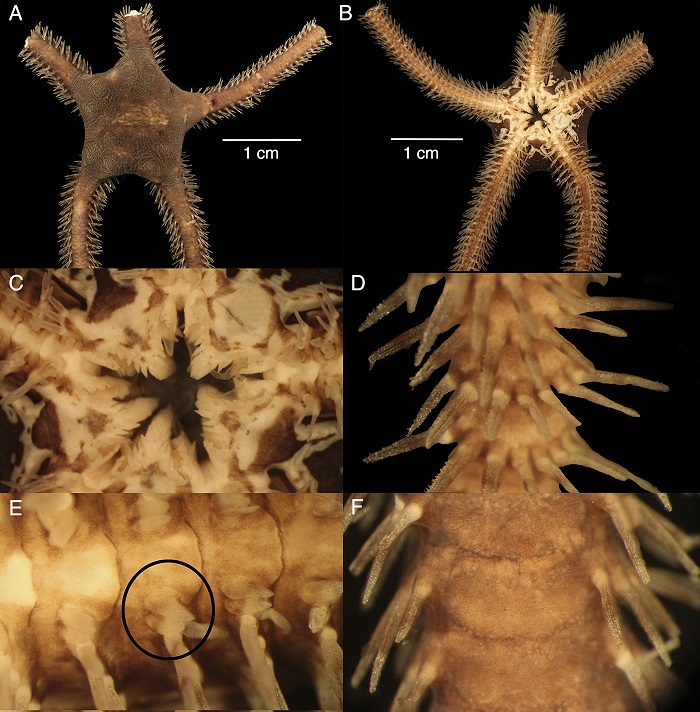 Disc small (diameter 15 mm in specimen from Blake Reef, 19 mm in specimen from Alacranes Reef), pentagonal, covered with smooth skin. Radial shields covered by skin. Each jaw with 6-7 oral papillae, outermost rectangular with rounded tips, next 3 pairs pointed, infradental thicker and pointed. Oral shields elliptical, much broader than long, touching first lateral arm plate, with rounded tips. Adoral shields narrow. Genital slits prominent, thicker, not reaching periphery of disc. Five arms, longest one 95 mm long. Dorsal arm plates large, oval, twice as wide as long; some arm segments fragmented. Ventral arm plates quadrangular, covered by skin. Lateral arm plates enlarged and flared at distal ends; second lateral arm plate particularly enlarged, nearly reaching edge of disc. Six to 7 arm spines proximally in Blake Reef specimen and 7-8 arm spines in Alacranes Reef specimen, ventralmost the largest (2.5 mm), reaching almost 1 and one-half arm segments, distally 5-6 arm spines, terminal part of arms with 4-5 arm spines; pointed, hyaline, serrated, directed downwards. Tentacle pores large, widely open; each one armed with 2 large, elongated tentacle scales, outermost pore thicker and shorter than innermost one.