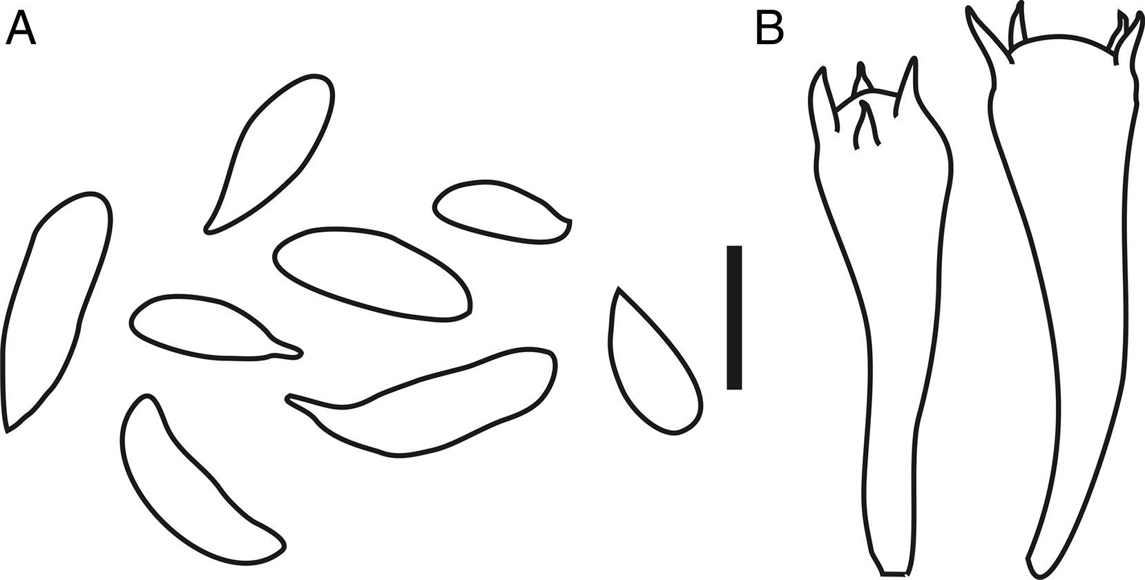 El material coleccionado fue fotografiado y descrito macroscópicamente in situ , utilizando la terminología propuesta por Largent (1986), Lodge et al. (2004) y Wright y Albertó (2002). Para las observaciones microscópicas (elementos del revestimiento pileico, del contexto del píleo y del estípite, de las láminas, basidiosporas, basidios, cistidios, etc.) se realizaron cortes a mano alzada montados en KOH 5% teñidos con floxina acuosa al 1% y reactivo de Melzer (Wright y Albertó, 2002). Las medidas de todas las estructuras se dan en rangos. En el caso particular de las esporas, se utilizan las siguientes abreviaturas: x = media aritmética del largo y ancho de las esporas, Q = rango de variación en el coeficiente entre la longitud y el ancho de las esporas, Qx = media de los valores de Q, n = número de esporas medidas. Para los colores se utilizó la terminología propuesta por Kornerup y Wanscher (1978). Los autores de los nombres científicos se indican de acuerdo con el Index Fungorum-Authors of Fungal Names (2014), y las siglas de los herbarios según Thiers (2014). El material recolectado está depositado en el herbario del Instituto de Botánica del Nordeste (CTES).