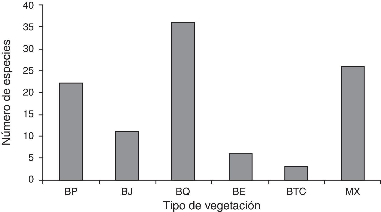 Los helechos y licofitas forman parte de la vegetación primaria o secundaria y en los límites de varios tipos de vegetación, muchas especies se distribuyen en diversos ecosistemas y otras que son característicos de ciertos hábitats (Riba, 1998). El bosque de pino (BP) se ubica en un rango altidudinal de 1,600 a 2,600 msnm, mientras que el bosque de Quercus (BQ) se localiza entre 2,200 y 2,400 msnm; sin embargo, en algunas localidades el bosque de pino se presenta en la ladera este de una montaña y el bosque de Quercus en la ladera oeste de la misma. Asimismo, el bosque tropical caducifolio (BTC) se encuentra entre 1,300 y 1,500 msnm, y en el mismo se encontraron 3 especies de helechos, de las cuales solo 1 es compartida con el bosque de pino y el bosque de Quercus . El matorral xerófilo (MX) se ubica entre 1,100 y 2,200 msnm con una pendiente muy pronunciada, y en el mismo se hallaron 6 especies de licofitas y 20 de helechos; en algunas localidades con MX se encontraban individuos aislados de Pinus , Quercus o Juniperus , lo cual permitió el establecimiento de especies epífitas como Pleopeltis polylepis var. polylepis y P. thyssanolepis . El bosque espinoso (BE) y el bosque de Juniperus (BJ) localizados entre 2,300 y 2,450 msnm, se relacionan en cuanto a composición florística de helechos con el matorral xerófilo, pues no se encontraron licofitas en estos hábitats. La relación se debe a que todas las especies de BE están presentes en el MX y de las 11 especies de helechos del BJ, 8 son compartidas con el MX. Cabe mencionar que en algunas localidades visitadas pertenecientes al matorral xerófilo (localidades19-21 en la figura 1) no se encontraron ni helechos ni licofitas, a pesar de visitar en varias ocasiones estos sitios.