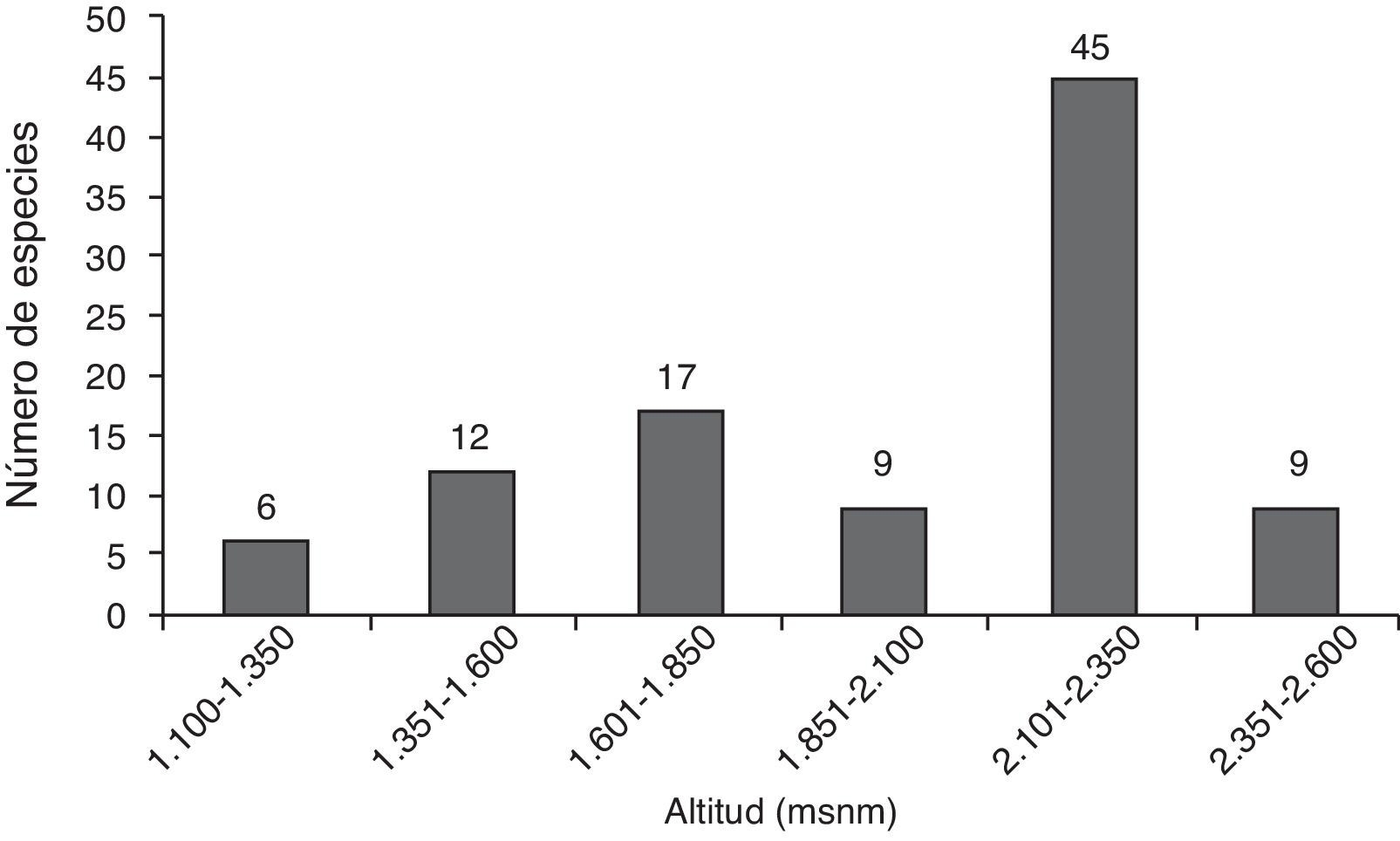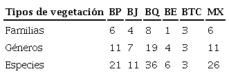 En la figura 3 se observa el número de especies por rango altitudinal, y es el intervalo de los 2,101 a 2,350 msnm el que presenta la cifra mayor de taxones (45), pero en este confluyen diferentes tipos de vegetación. Mediante el análisis de correspondencia se obtuvo una gráfica (figura 4) que muestra que los tipos de vegetación BP, BQ y BTC presentan una composición florística de helechos y licofitas independiente, es decir, difieren notablemente entre sí y de BJ, BE y MX ubicándose en un cuadrante distinto en la gráfica. Asimismo, se observa que el BJ, BE y MX tienen una composición similar, agrupándose en el centro de la gráfica. Los factores 1 y 2 explican estos resultados con un valor de 54.64%.