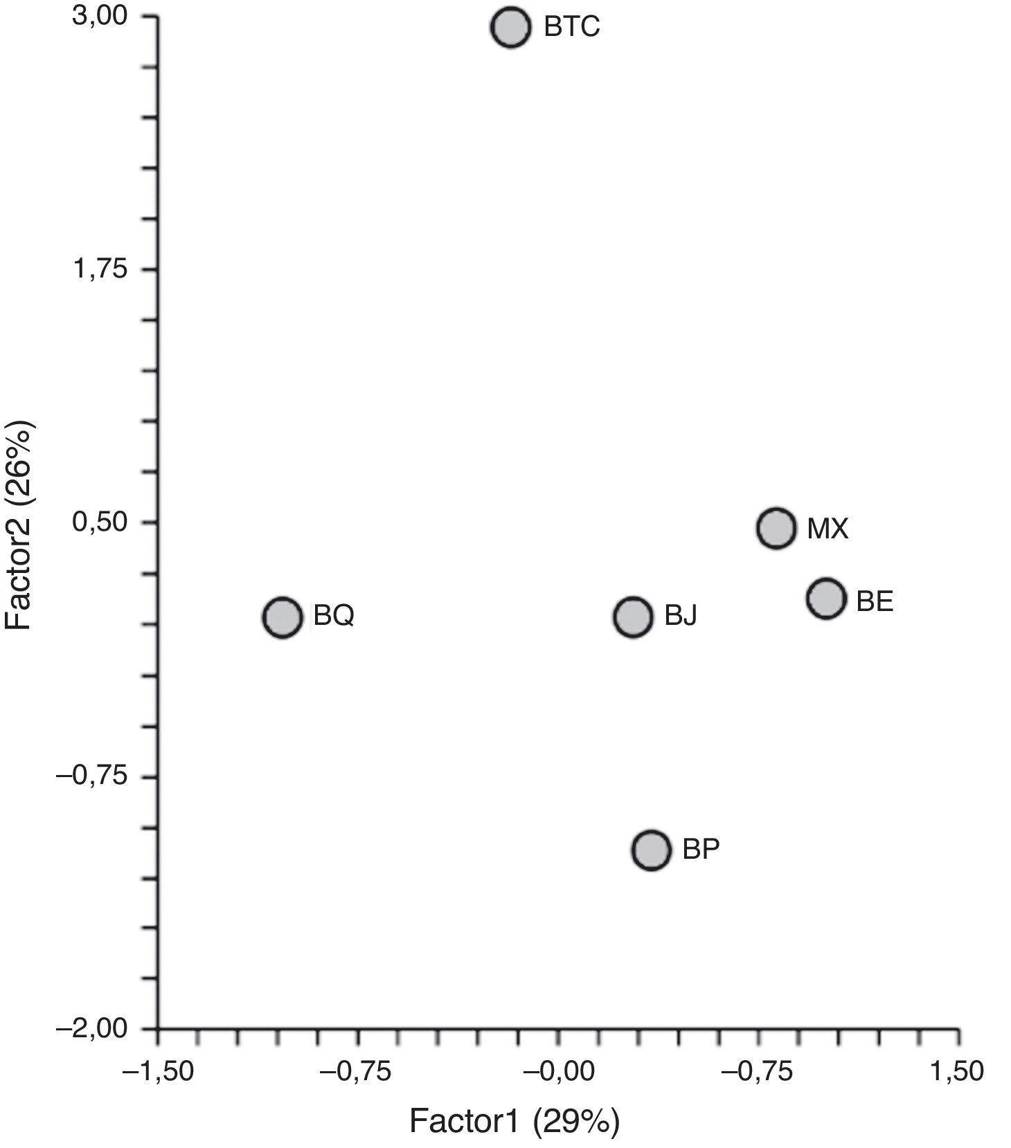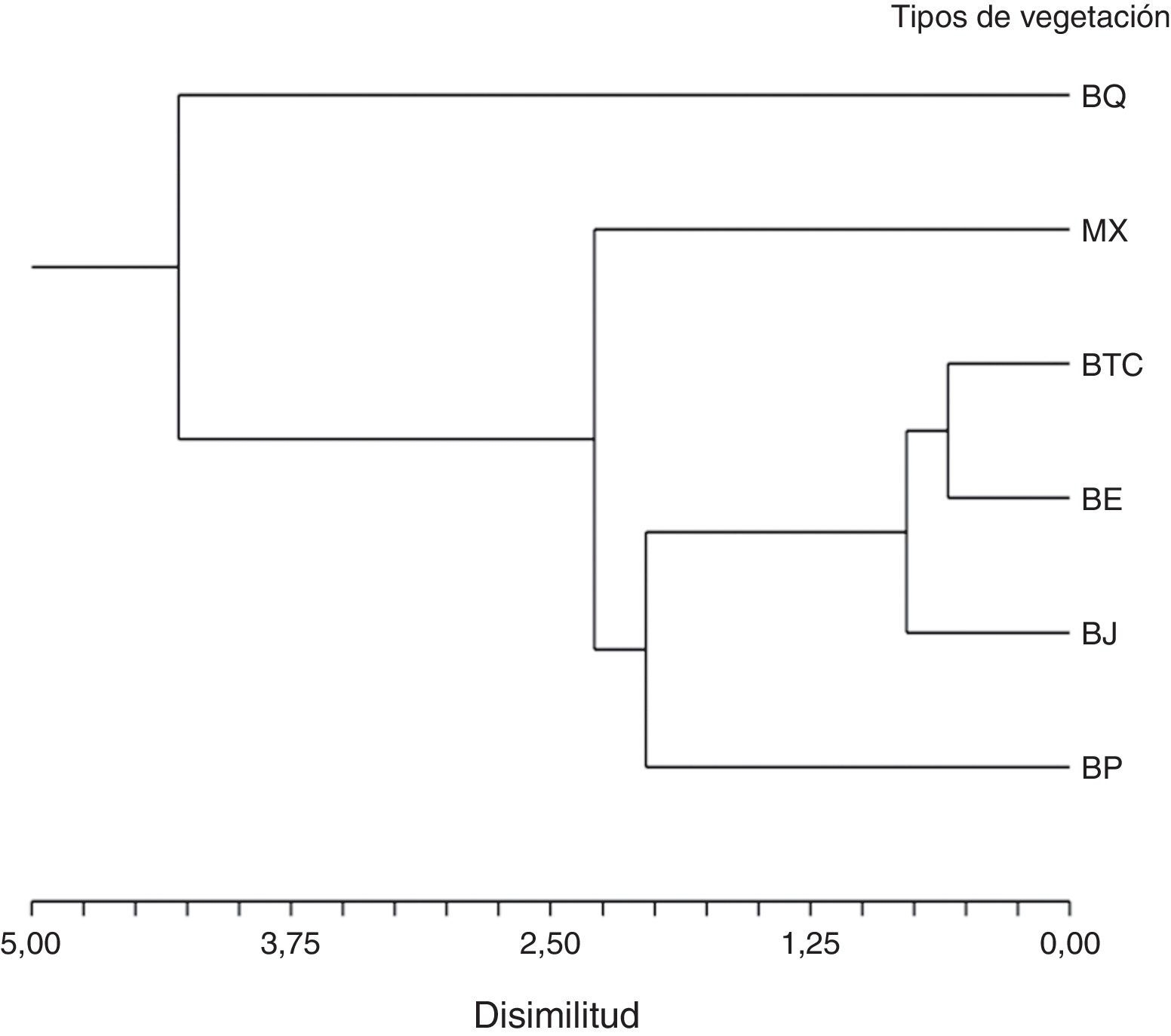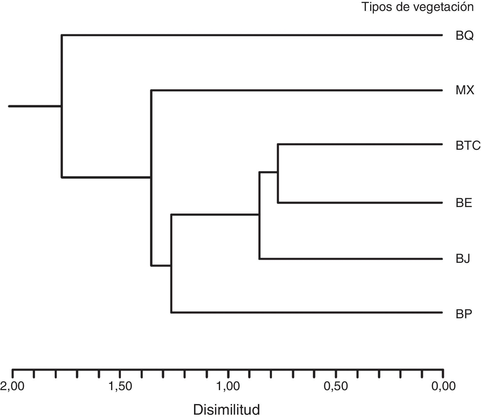 El dendrograma obtenido mediante el método de varianza mínima de Ward (figura 5) muestra un solo grupo formado por BE, BTC y BJ, teniendo un valor de 0.79 unidades de disimilitud. Aunque BE y BTC son los sitios más parecidos (0.59 unidades), BJ se separa de ellos solo por 0.20 unidades, considerándose así que los 3 tipos de vegetación son similares en cuanto a número de especies; BP, BQ y MX cuentan un mayor número de taxones, siendo BQ el de mayor valor (tabla 4). El dendrograma obtenido mediante el análisis de grupos promedio (figura 6) muestra resultados similares, ya que las relaciones entre los tipos de vegetación son en general las mismas aun cuando los valores de disimilitud son menores.
