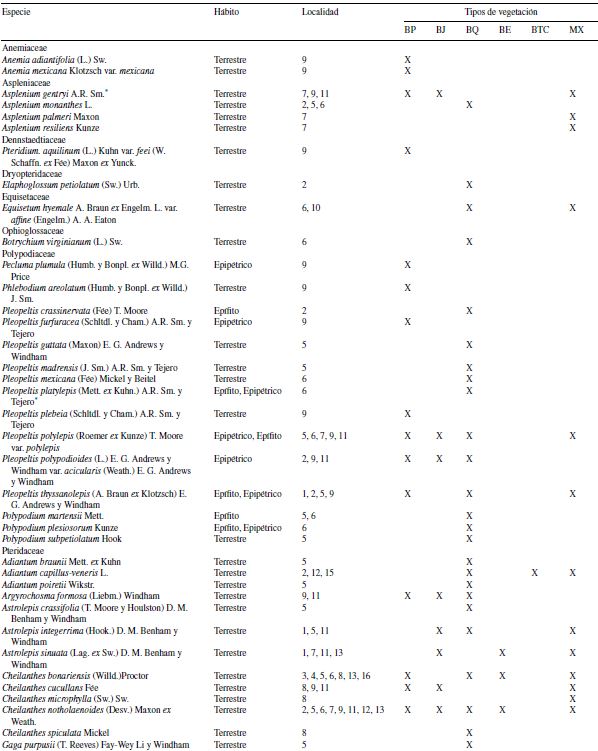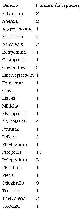 Se registraron 63 taxones agrupados en 26 géneros y 12 familias, de las cuales 9 especies corresponden a la familia Selaginellaceae. Las familias mejor representadas en cuanto a géneros fueron Pteridaceae con 11 géneros (42.3%) y Polypodiaceae con 4 taxones (15.3%); el mayor número de especies pertenecen a Pleopeltis, Selaginella y Cheilanthes con 10, 9 y 5, respectivamente (tabla 3). Las especies más frecuentes en el municipio fueron Cheilanthes notholaenoides (Desv.) Maxon ex Weath., Cheilanthes bonariensis (Willd.) Proctor, Thelypteris kunthii (Desv.) C. V. Morton y Pleopeltis polylepis (Roemer ex Kunze) T. Moore var. polylepis , encontrándose la primera presente en 5 tipos de vegetación y las demás en 4 (tabla 2).