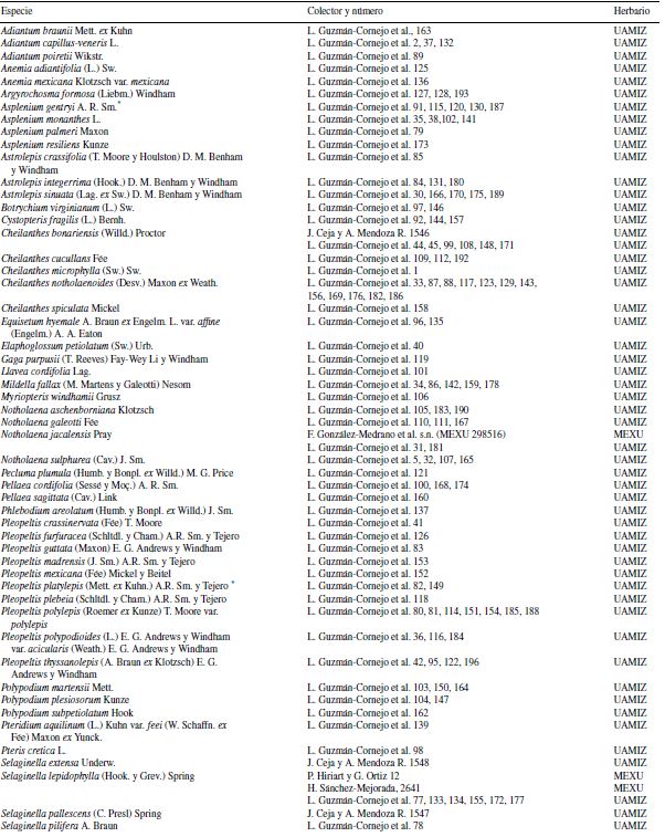 Los ejemplares fueron determinados a nivel de género y especie utilizando los trabajos de Mickel y Smith (2004), para algunos géneros se actualizó la nomenclatura y taxonomía de acuerdo con Fay-Wei, Pryer y Windham (2012), Grusz y Windham (2013) y Smith y Tejero-Díez (2014). La asignación de familias se hizo de acuerdo con lo propuesto por Smith et al. (2006). Los ejemplares identificados y debidamente etiquetados se montaron para ser incorporados al Herbario Metropolitano Dr. Ramón Riba y Nava Esparza (UAMIZ).