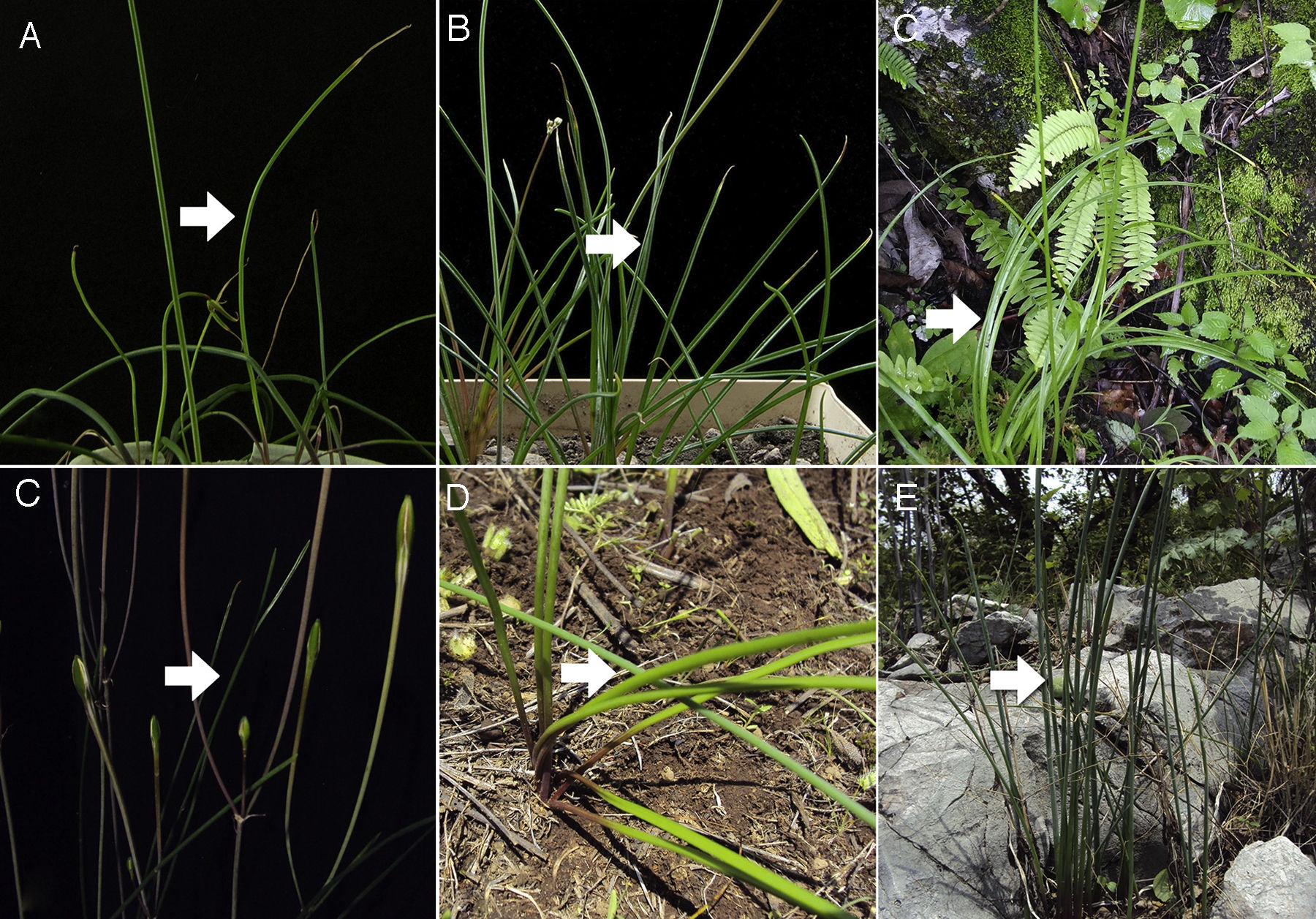 Las hojas son lineares, mayormente rollizas y subrollizas, en D. balsensis , D. thadhowardii y P. decora triangulares (fig. 2), y en M. biflora aplanadas (poblaciones 846, 902). La base de la lámina es aplanada e incolora, el ápice de la lámina es agudo en la mayoría de las especies, excepto en M. magnifica , M. mexicana y algunas poblaciones de B. elegans en las que es obtuso, el margen es entero, excepto en M. bryani , M. rosea, M. oaxacana y algunas poblaciones de M. biflora (896, 898, 988) en las que es involuto. D. balsensis , D. thadhowardii y P. decora presentan una quilla abaxial. La longitud de la lámina va de 50 cm en M. filifolia y M. biflora (1388) hasta 100 cm en M. magnifica . El diámetro de las hojas rollizas fluctúa entre 1 mm en M. filifolia y 24 mm en M. magnifica . Las especies con lámina triangular o aplanada tienen una anchura que va de 2-3 mm en D. thadhowardii hasta 4 mm en P. decora . El número de hojas por planta varía entre una en B. elegans y 7 en M. rosea . En general la lámina está postrada, y en ocasiones erecta antes de antesis o decumbente en algunas poblaciones de M. biflora (1156, 1257, 1344) (fig. 2). La lámina es glabra, con denticulaciones sobre los nervios excepto en algunas especies de Milla (M. filifolia , M. magnifica y una población de M. biflora 1196) donde la superficie es lisa.