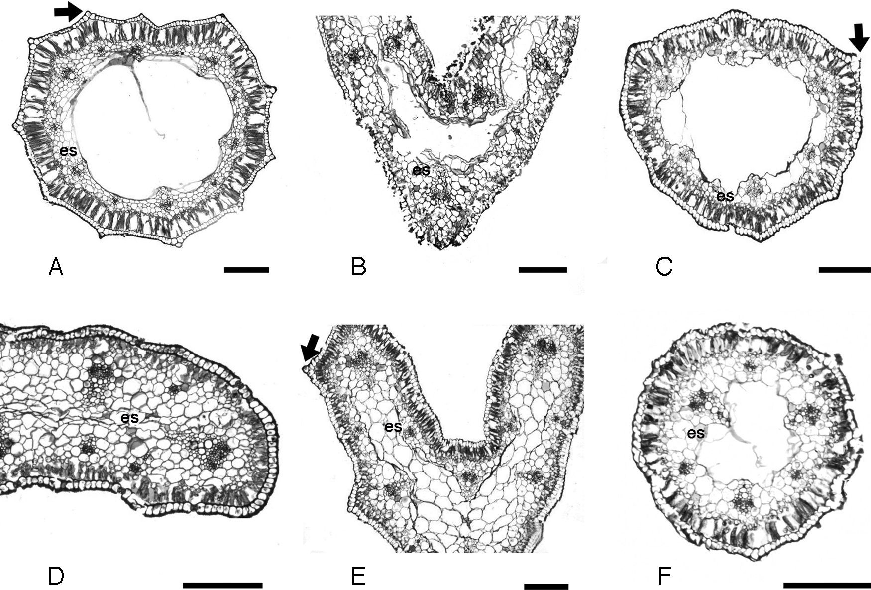 El desarrollo de un estrato de parénquima en empalizada es común en todos los taxa; mientras que el tamaño de sus células es homogéneo en la mayoría de los géneros, excepto en D. balsensis , D. thadhowardii y P. decora que presentan células del empalizada más cortas en la cara abaxial. Es possible que el cambio de tamaño se relacione con la forma obtriangular de la lámina. En los géneros del complejo Milla, la condición más común es que el parénquima esponjoso se colapse y forme un hueco, lo cual coincide con lo descrito para los géneros Allium , Asphodelus y Sisyrinchium (Goldblatt et al., 1990; Tanker y Kurucu, 1981). El colapso del parénquima esponjoso y la lisis celular son característicos de las hojas fistulosas (fig. 3A-C y 3F). Este carácter también se presenta en hojas xeromórficas como en Eriocaulon fistulosum (Eriocaulaceae), Juncus spp. (Juncaceae) y Gagea bohemica (Liliaceae) (Niklas, 1991; Peruzzi, Peterson, Tison y Peterson, 2008). La presencia de hojas fistulosas en el complejo Milla posiblemente sea una adaptación a ecosistemas secos para evitar la pérdida de agua, mantener una menor temperatura respecto al ambiente y contener mayor CO2 para la fotosíntesis (Gibson, 1996). En los miembros del complejo Milla, la presencia de hojas bifaciales se correlaciona con la condición fistulada. La correlación de estos caracteres posiblemente sea una novedad evolutiva para los géneros del complejo, pero para confirmar esta hipótesis es necesario evaluar la anatomía de los géneros del complejo Brodiaea tanto con hojas aplanadas como subrollizas (Hoover, 1939).