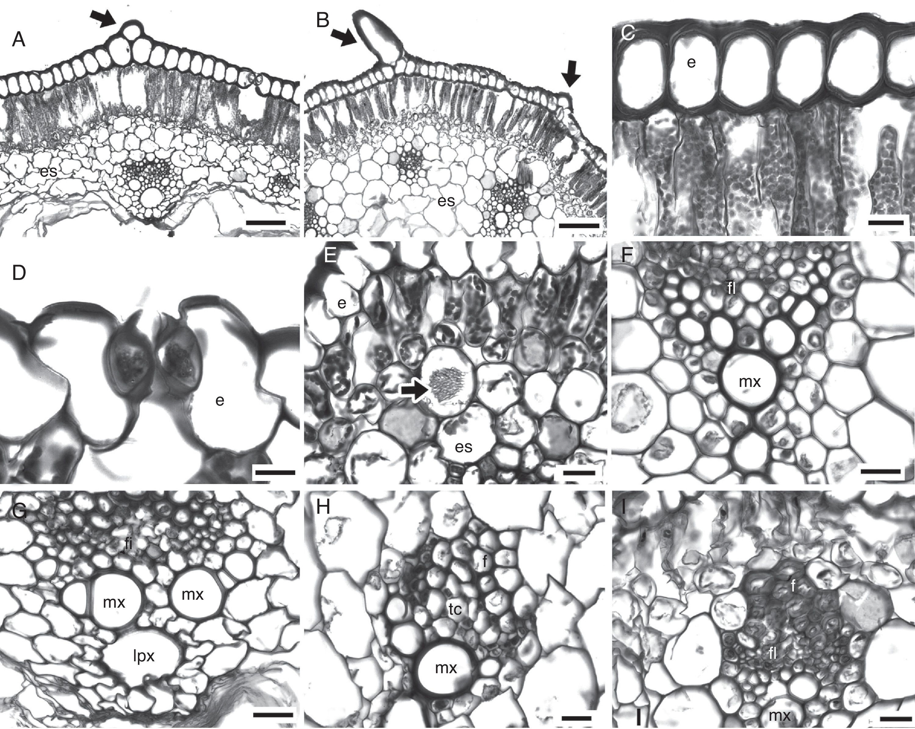 El perfil de la lámina en sección transversal varía (tablas 1 y 2; fig. 3A-D), y predomina la forma depresa obovada, seguida de la transversalmente elíptica y la circular. P. decora y 2 especies de Dandya se distinguen por su forma obtriangular (fig. 3B y 3E), mientras que M. biflora presenta todas las formas descritas para los otros géneros del complejo, excepto la obtriangular (tabla 2). La cutícula es estriada y delgada (< 1.5 μm) en todos los materiales examinados. La epidermis es simple, y sus células vistas en sección transversal tienen forma cuadrada o rectangular con la pared anticlinal más larga (fig. 4A-C). En algunos puntos de la epidermis se observan 3 células que provocan un levantamiento debido a la elevación de la célula central que forma una protuberancia (figs. 3A, 3C, 3E, 4A y 4B) excepto en algunas especies de Milla (M. filifolia y M. magnifica ) y algunas poblaciones de M. biflora en las que la epidermis es uniforme. Estas protuberancias en general se asocian a los haces vasculares y son conspicuas debido al alargamiento de la célula central (fig. 4A y 4B), la cual se clasifica en corta (< 50 μm), larga (50-100 μm) y muy larga (> 100 μm). La pared periclinal externa de la epidermis es delgada o engrosada, las anticlinales generalmente delgadas, excepto en Bessera que tiene todas las paredes gruesas (fig. 4C). Cuando la pared es gruesa, esta siempre es de naturaleza celulósica. Los estomas se ubican en las células epidérmicas ordinarias, con prolongaciones anteriores y posteriores (fig. 4D), y vistos en superficie son paracíticos. El mesofilo es bifacial. El parénquima en empalizada es uniestratificado, con células uniformes excepto en D. balsensis , D. thadhowardii y P. decora , en que son más cortas en la cara abaxial. El parénquima esponjoso es compacto con células de menor a mayor tamaño hacia el centro de la hoja y de forma isodiamétrica. La parte más interna del mesofilo se colapsa o hay lisis celular y se forma un hueco (figs. 3A, 3B, 3C y 3F) excepto en 3 especies de Dandya (D. balsensis, D. hannibalii y D. thadhowardii ), 3 especies de Milla (M. mexicana, M. mortoniana y M. potosina ) y algunas poblaciones de M. biflora (fig. 3D y 3E). El mesofilo de todas las especies contiene rafidios dispersos (fig. 4E). Los haces vasculares son colaterales y se localizan subyacentes al parénquima en empalizada, se alternanen grandes y pequeños, y se disponen en una fila o formando un anillo en las hojas rollizas (fig. 3). El número de haces vasculares es variable dentro y entre géneros (tabla 1) y las especies de Milla muestran los extremos de la variación registrada (tabla 2). El metaxilema se dispone en forma de "t" en las especies de Bessera o de "v" en el resto de los taxa (fig. 4F y 4G) y el floema tiene tubos cribosos y células acompañantes muy pequeños comparados con los elementos del metaxilema (fig. 4H). El esclerénquima está conformado por paquetes de fibras que se ubican exclusivamente sobre el floema, con número y grosor variables. La mayoría de los materiales presentan pocas fibras (<15) con pared delgada o gruesa, Milla comúnmente tiene mayor abundancia de éstas (>20) y con paredes más gruesas (tablas 1 y 2; fig. 4I).