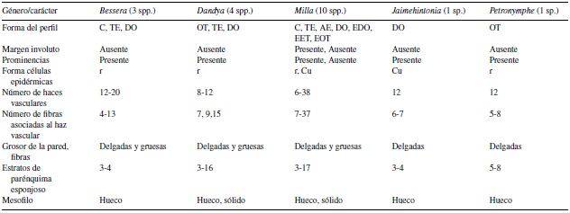 Bessera es el único género que presenta metaxilema en forma de "t" (fig. 4G) y todas las paredes de la epidermis colenquimatosas. Los otros géneros carecen de caracteres exclusivos; sin embargo, hay especies que pueden reconocerse por la combinación única de atributos foliares. Por ejemplo, D. hannibalii y D. purpusii , vistos en sección transversal, tienen el perfil de la lamina transversalmente elíptico, al igual que Bessera y Milla . En cambio, D. balsensis y D. thadhowardii presentan el perfil de la lámina obtriangular, semejante a Petronymphe , así como abundante tejido parenquimatoso dispuesto a lo largo de la costa (fig. 3B). Jaimehintonia gypsophila, B. tuitensis , y algunas poblaciones de B. elegans y de M. biflora (1129, 1130, 1165, 1391, 1400, 1254, 1263) comparten el perfil de la lámina depresa obovado (tabla 2). Los haces vasculares son por lo general más numerosos en Bessera (12-20) y Milla (6-38), y Petronymphe y Jaimehintonia comparten la presencia de 12 haces vasculares, mientras que Dandya tiene de 8-12 haces. Bessera, Dandya y Milla presentan fibras con paredes más gruesas y en mayor número que Jaimehintonia y Petronymphe y el mesofilo sólido agrupa a 3 especies de Dandya (D. balsensis, D. hannibalii y D. thadhowardii ), M. mexicana, M. potosina y 2 poblaciones de M. biflora (1127 y 1271).