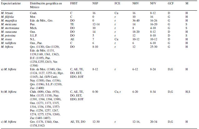 Howard (1999) describió M. filifolia, M. mexicana y a partir de segregaciones de poblaciones de M. biflora , basándose en caracteres florales y vegetativos. Este autor señaló que en M. filifolia las hojas son subteretes diminutamente acanaladas adaxialmente y convexas abaxialmente; en M. mexicana , teretes o subteretes, y en M. potosina , cóncavo-convexas. La anatomía foliar de estas especies revela que el perfil de la lámina es transversalmente elíptico en M. mexicana y depresa obovada en M. potosina (tabla 2). M. filifolia exhibe las hojas más delgadas (≤1 mm), de forma circular en sección transversal y solo comparte con M. magnifica la epidermis sin protuberancias.