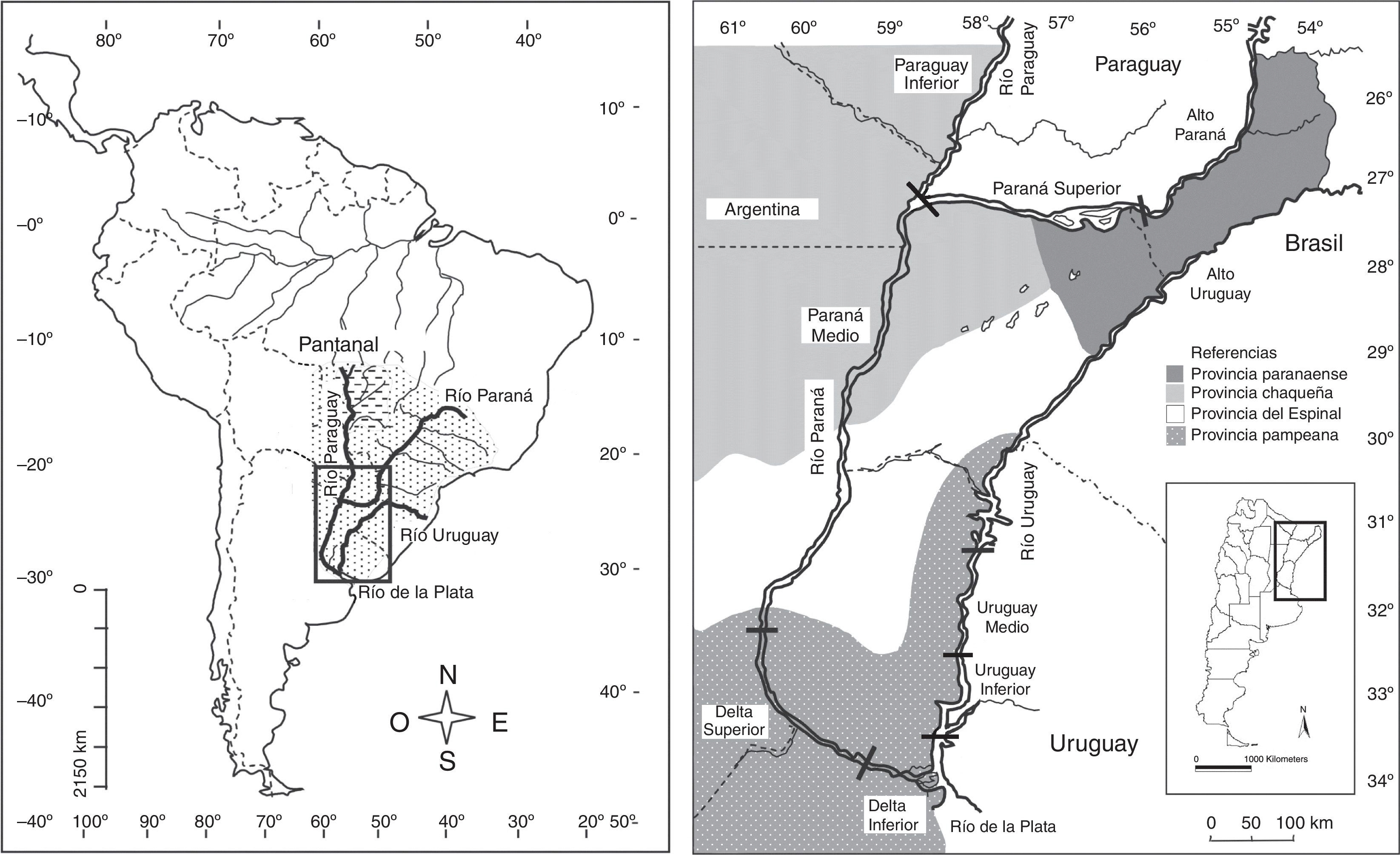 Constituida por la región subtropical-templada de la cuenca del Plata, que se extiende entre los 25 y 35° S, presenta 3 grandes ríos colectores: Paraná, Uruguay y Paraguay (fig. 1). Abarca una superficie de unos 710,000 km2, en el noreste de la Argentina, con un clima que varía desde subtropical húmedo en el norte, a templado húmedo de llanura en el sur. Las temperaturas medias anuales varían desde los 22 °C en el norte a los 17 °C al sur, y las precipitaciones medias anuales desde 1,800 mm (Misiones) a 1,000 mm (Santa Fe, Entre Ríos y Buenos Aires) (Paoli, Iriondo y García, 2000). Según Cabrera (1994) la región se enmarca en las siguientes provincias fitogeográficas (fig. 1): 1) Paranaense: selvas húmedas subtropicales pluriestratificadas y semideciduas; 2) Chaqueña: representada por el distrito Chaqueño Oriental o Chaco Húmedo, caracterizado por bosques xerófilos de quebracho colorado (Schinopsis balansae) , palmares de Copernicia alba y sabanas; 3) del Espinal: bosques xerófilos caducifolios dominados por Prosopis , palmares de Butia yatay , sabanas graminosas y estepas arbustivas; 4) Pampeana: estepas de gramíneas.