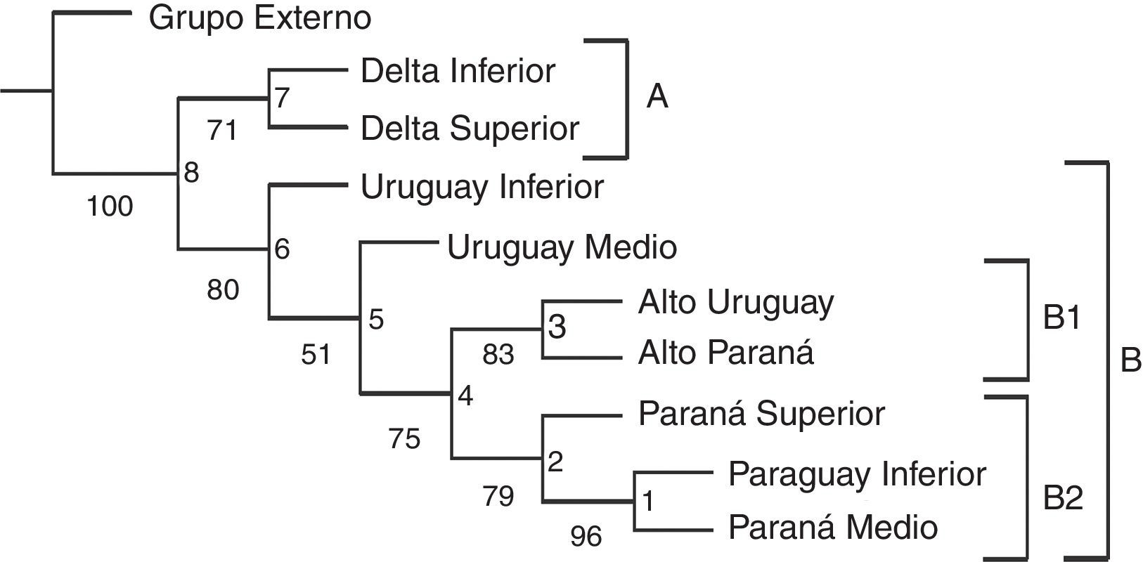 Se obtuvo un solo árbol (fig. 2) con un índice de consistencia de 0.578 y un índice de retención de 0.581. Los valores de Jacknife fueron altos con todas las ramas sustentadas por más del 50%. Se observan 2 grandes clados (fig. 2). El clado A formado por los tramos DS e Inferior (Jacknife del 71%) queda definido por Amerotyphlops brongersmianus , Xenodon semicinctus , Phalotris bilineatus y Psomophis obtusus . El DI cuenta con una especie, Epictia munoai , no registrada en el DS, y en este tramo se encuentran especies como Helicops leopardinus , Hydrodynastes gigas y Leptophis ahaetulla marginatus , no registradas en el DI. El clado B (fig. 2) está formado por el Uruguay Inferior y Medio como basales y 2 subclados B1 y B2. El subclado B1 está conformado por el Alto Uruguay y Alto Paraná, comparten las siguientes especies (sinapomorfías): Liotyphlops beui , Atractus taeniatus , Erythrolamprus miliaris orinus , Spilotes pullatus , Tomodon dorsatus , Xenodon histricus , X. neuwiedii , Bothrops jararaca y Bothrops jararacussu. El subclado B2 está bien sustentado y conformado por: [(Paraguay Inferior-Paraná Medio) Paraná Superior]. Sus especies sinapomórficas son Mastigodryas bifossatus triseriatus , Clelia clelia , Hydrops caesurus , Leptodeira annulata pulchriceps , Lygophis meridionalis , Erythrolamprus poecilogyrus caesius , Mussurana bicolor , Philodryas olfersii latirostris , Bothrops diporus ; y las especies exclusivas del Paraguay Inferior-Paraná Medio son Atractus snethlageae , Lygophis dilepis , Philodryas mattogrossensis , Thamnodynastes chaquensis , Xenodon pulcher y Micrurus pyrrhocryptus (tabla 2).