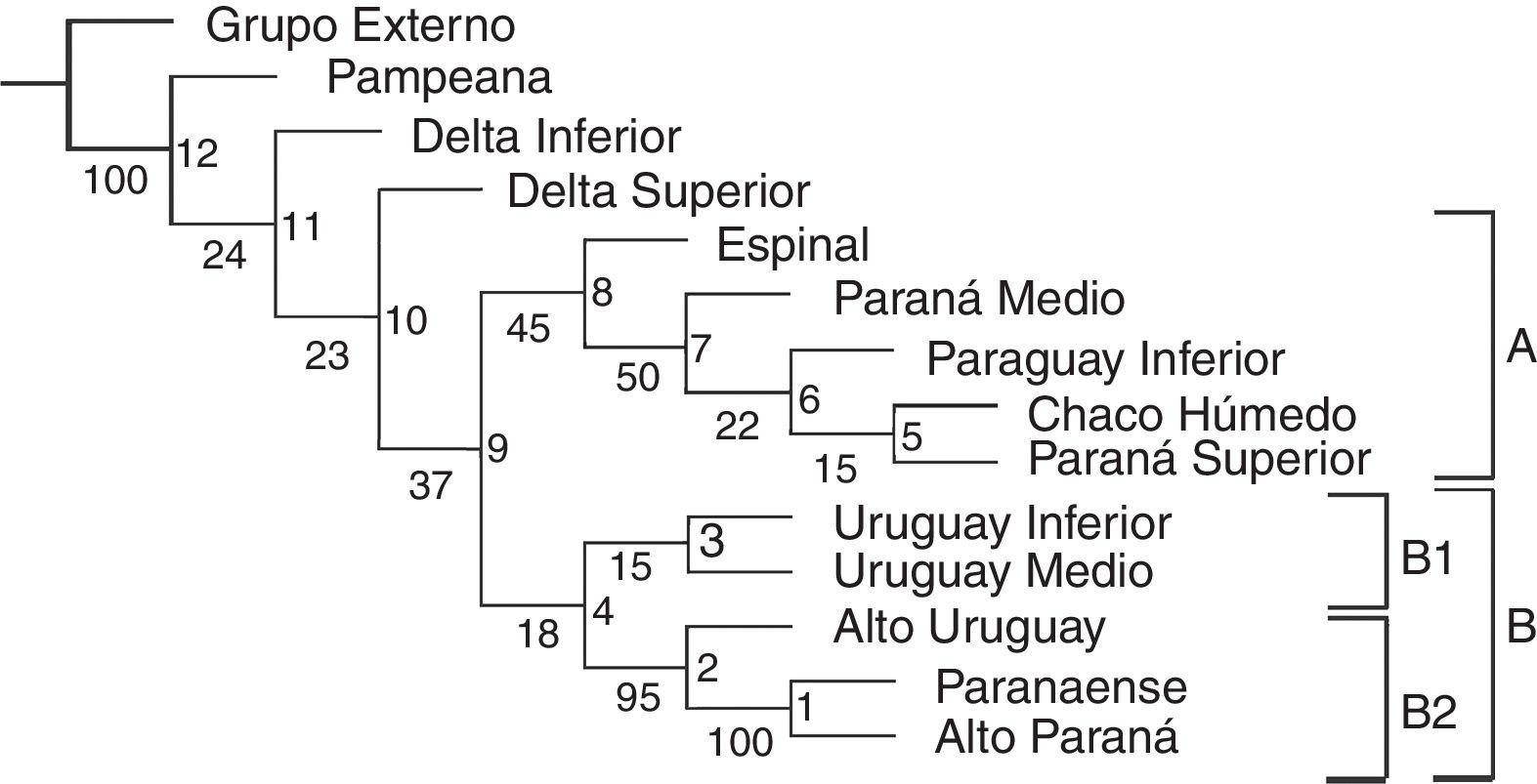 El árbol obtenido incluyendo los tramos de los ríos y las regiones fitogeográficas (fig. 3) muestra bajos valores de Jacknife en la mayoría de los nodos con soportes menores a 50%. El índice de consistencia es 0.500 y el índice de retención es 0.652. Se distingue el clado A, formado por [(((Paraná Superior-Chaco Húmedo) Paraguay Inferior) Paraná Medio) Espinal], con soporte del 45%. El clado B queda definido por especies de la región Paranaense y exclusivas de los ríos en estos sectores, Chironius bicarinatus , Philodryas olfersii olfersii y Micrurus altirostris (fig. 3). Este clado comprende 2 subclados: B1, con bajo soporte (15%), conformado por el Uruguay Medio e Inferior y definido por Phalotris lemniscatus y Taeniophalus poecilopogon; y B2, con soporte muy elevado (95%), conformado por [(Alto Paraná-Paranaense) Alto Uruguay] que presentan 13 sinapomorfías (tabla 3).