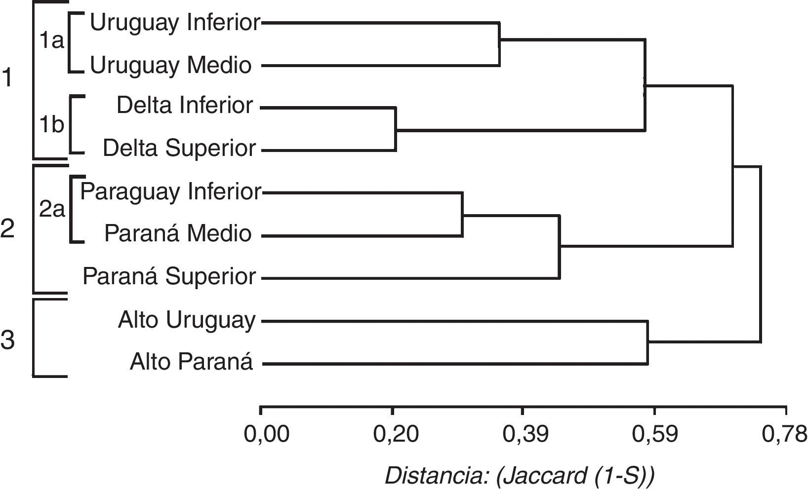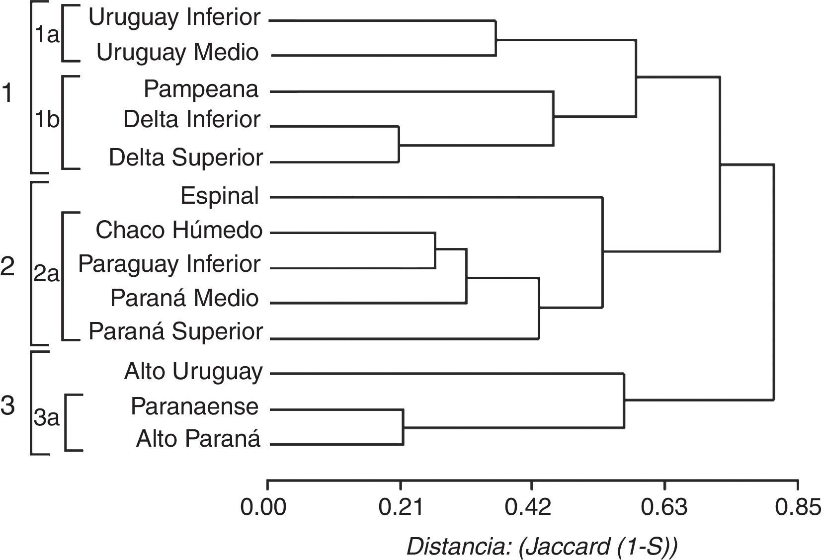 Los análisis de similitud entre los tramos de los ríos considerados y las regiones fitogeográficas dieron como resultado 3 grandes grupos indicados como 1, 2 y 3 en la figura 5. El grupo 1 incluye el núcleo de mayor similitud formado por el DI y Superior (tabla 4) que se une con la provincia fitogeográfica Pampeana y con menor similitud con el núcleo constituido por el Uruguay Medio y el Inferior. El grupo 2 incluye al Paraguay Inferior con el Chaco Húmedo, que comparten 42 especies. Este núcleo se relaciona con el Paraná Medio y luego con el Paraná Superior, y se une con menor similitud con la provincia del Espinal (fig. 5). El grupo 3 está constituido por la provincia Paranaense y Alto Paraná, núcleo de mayor similitud (complemento de Jaccard 0.22) que comparten 43 especies de las 48 que contiene el Alto Paraná, este nodo se relaciona con el Alto Uruguay, con el cual comparte 25 taxones.