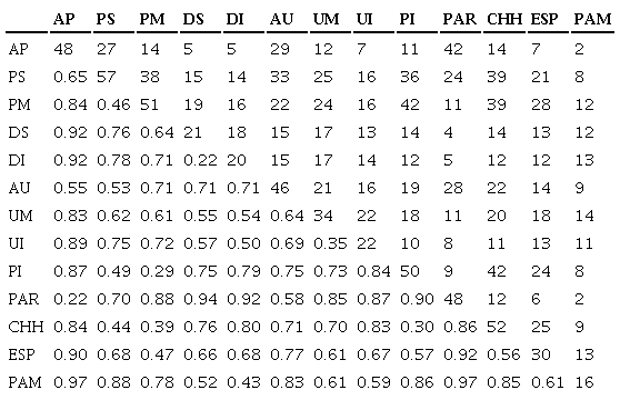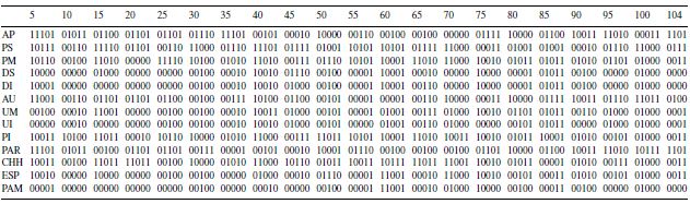 Matriz de presencia/ausencia de 104 taxones de serpientes (nombres de las especies en orden numérico en el anexo en los tramos de los ríos [AP:Alto Paraná; PS:Paraná Superior; PM:Paraná Medio; DS:Delta Superior; DI:Delta Inferior; AU:Alto Uruguay; UM:Uruguay Medio; UI:Uruguay Inferior y PI:Paraguay Inferior]) y las regiones fitogeográficas [PAR:Paranaense; CHH:Chaco Húmedo; ESP:Espinal y PAM:Pampeana]).