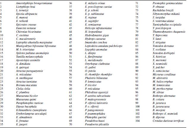 Obtuvimos 13,039 registros de 104 especies de serpientes (tabla 1) mediante la revisión de colecciones herpetológicas y de literatura confiable con localidad precisa (ver Arzamendia y Giraudo, 2009 para detalles), y la realización de 361 campañas de muestreo entre 1989 y 2013, priorizando regiones poco conocidas y muestreadas con el objetivo de complementar los datos obtenidos en colecciones y literatura para minimizar posibles sesgos. Los mapas de distribución de los taxones se confeccionaron con Diva Gis 7.5 (Hijmans et al., 2005).
