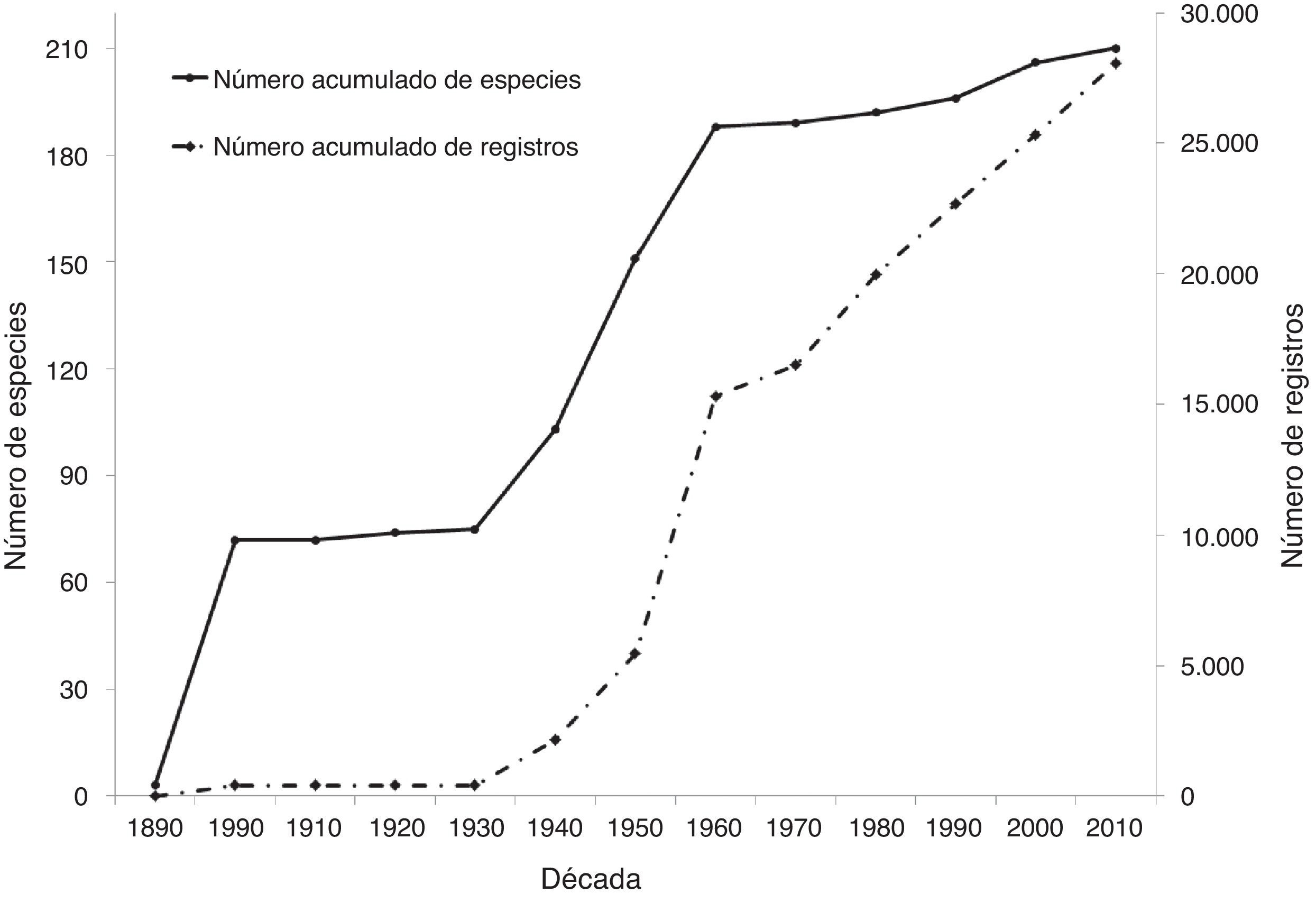 Los esfuerzos formales para documentar la mastofauna de Oaxaca se presentaron en la década de 1890 con A. C. Buller, quien recolectó los primeros mamíferos en la Planicie Costera de Tehuantepec y están depositados en The Field Museum of Natural History, Chicago. A partir de la década de 1960, se incrementa el esfuerzo de muestreo con las exploraciones de T. MacDougall, S. Booth, J. Schaldach y M. D. Tuttle, entre otros, quienes recolectaron en gran parte del estado y adicionaron un gran número de especies (188) (fig. 1). La curva acumulada de registros muestra que a partir de 1940 se intensificaron las exploraciones mastozoológicas en Oaxaca con 2,148 y alcanzaron los 16,489 registros en 1980; posteriormente, el incremento fue constante hasta el 2014. En cuanto al número acumulado de especies, en la década de 1910 se conocían 72 especies, cifra que se mantuvo casi constante hasta 1940, posteriormente se incrementa a 189 en 1970, década a partir de la cual la adición de nuevas especies es menor (fig. 1).