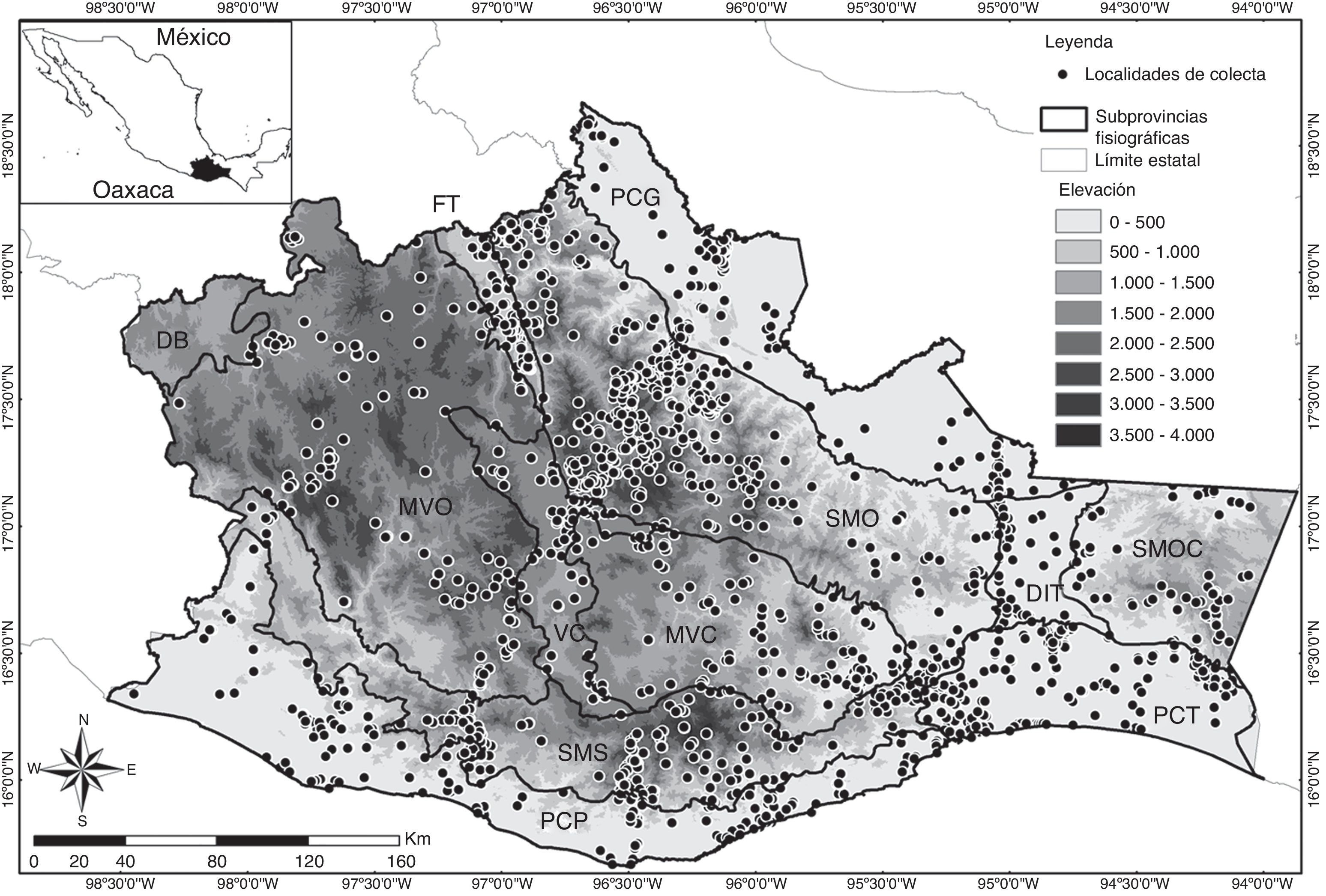 El estado de Oaxaca se localiza al sur de México, entre las coordenadas geográficas 15°39' y 18°39' N y 93°52' y 98°32' O, con una superficie de 95,364 km2, que representa el 4.8% del territorio nacional (García-Mendoza, 2004). Tiene una orografía compleja y se reconocen 12 subprovincias fisiográficas que se distinguen por poseer rasgos geomorfológicos estructurales propios (Ortiz-Pérez, Hernández-Santana y Figueroa Mah-Eng, 2004). El estado presenta un intervalo altitudinal que va desde el nivel del mar hasta los 3,600 m, lo que facilita la presencia de 26 tipos de climas, desde cálidos secos en la Planicie Costera del Pacífico hasta templados en los picos montañosos de las principales sierras (Trejo, 2004). Existen 26 tipos de comunidades vegetales, de las cuales el bosque de pino, la selva baja caducifolia, pastizales y selva alta perennifolia cubren el 20, 13, 12 y 11% de la superficie del estado, respectivamente (Torres-Colín, 2004).