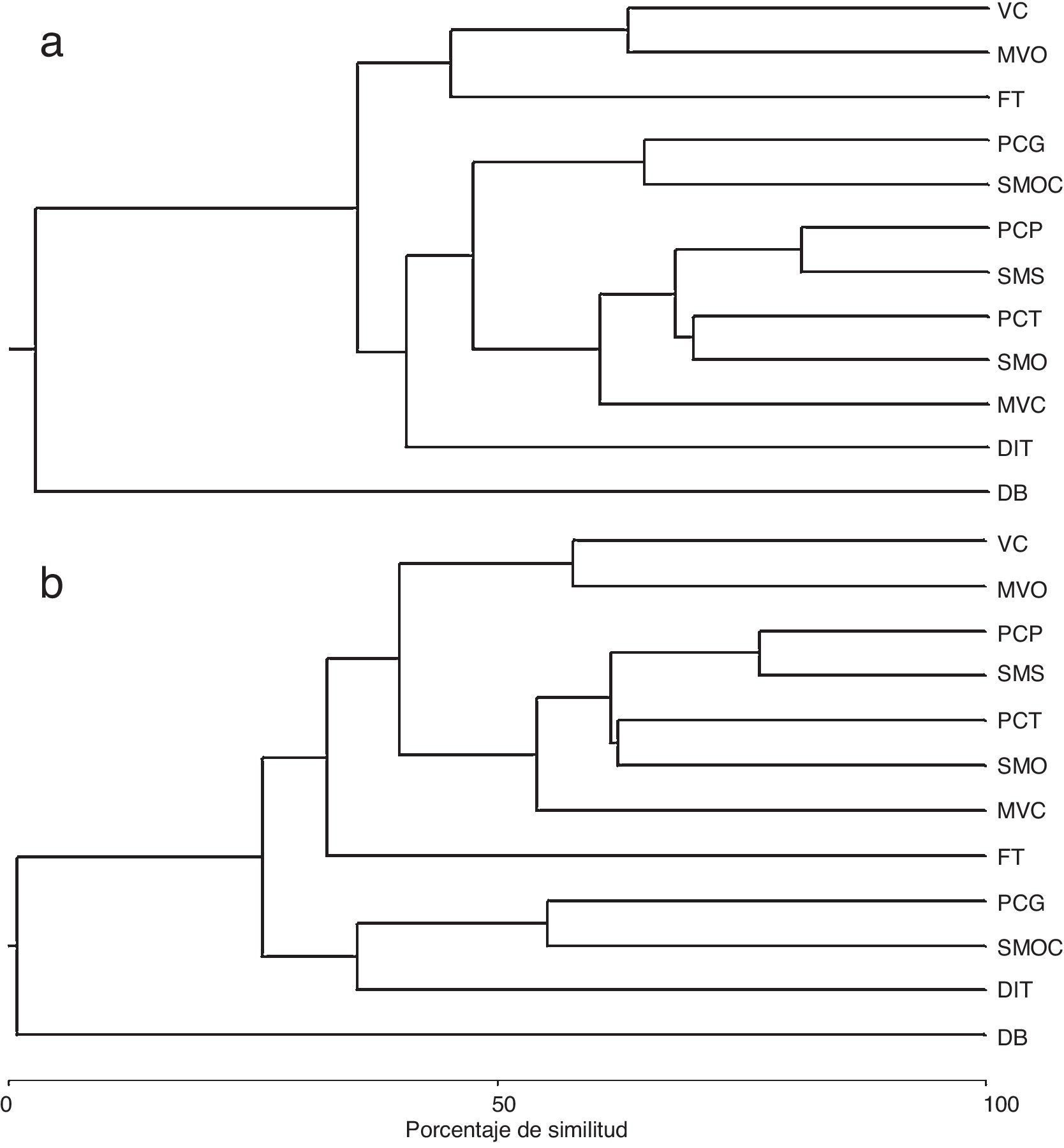 Con un coeficiente de correlación de 0.967, en el análisis de similitud de Jaccard se reconocen 2 principales grupos: el formado por las subprovincias que se encuentran en la vertiente del Atlántico (Planicie Costera del Golfo, Sierra Madre del Sur de Oaxaca y Chiapas, y la Depresión del Istmo de Tehuantepec) y el que integran las subprovincias del centro de Oaxaca (Sierra Madre de Oaxaca, Sierra Madre del Sur, Montañas y Valles del Centro, Montañas y Valles del Occidente) y de la vertiente del Pacífico (Planicie Costera del Pacífico y Planicie Costera de Tehuantepec). La mayor similitud taxonómica específica entre subprovincias se presenta entre la Planicie Costera de Pacífico y la Sierra Madre del Sur (78%), entre la Planicie Costera de Tehuantepec y la Planicie Costera del Pacífico (68%), entre la Sierra Madre de Oaxaca y la Sierra Madre del Sur (64%) y entre la Planicie Costera del Pacífico y la Sierra Madre de Oaxaca (64%). En cambio, en las subprovincias Sierra Madre del Sur de Oaxaca y Chiapas y los Valles Centrales (28%), la Depresión del Istmo de Tehuantepec y las Montañas y Valles del Occidente (28%) y la Fosa de Tehuacán y la Sierra Madre de Oaxaca y Chiapas fueron las de menor similitud (fig. 3). Al incluir categorías taxonómicas supraespecíficas, la mayor similitud entre subprovincias se observó entre Sierra Madre del Sur y la Planicie Costera del Pacífico (81%), la Planicie Costera Tehuantepec y la Planicie Costera del Pacífico (75%), así como la Sierra Madre de Oaxaca y la Sierra Madre del Sur (69%). En cambio, las subprovincias más disímiles fueron la Depresión del Istmo de Tehuantepec y las Montañas y Valles del Occidente (0.36), la Planicie Costera del Golfo y los Valles Centrales (36%), así como la Sierra Madre de Oaxaca y Chiapas y los Valles Centrales (38%) (fig. 3).