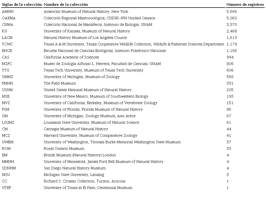 La base de datos de mamíferos terrestres para el estado de Oaxaca estuvo conformada por 32,829 registros, de los cuales 4,770 corresponden a ejemplares albergados en colecciones científicas y que fueron documentados en una o más publicaciones (Goodwin, 1969 y Hall, 1981); por tanto, el número de registros únicos es de 28,060, de los cuales 3,308 están presentes en literatura y 24,752 se encuentran en 23 colecciones extranjeras y 4 nacionales: 14,348 y 10,404 registros, respectivamente. Las colecciones que cuentan con mayor número de ejemplares son el American Museum of Natural History, New York (5,666 registros), la colección mastozoológica del Centro Interdisciplinario de Investigación para el Desarrollo Integral Regional, Unidad Oaxaca, del Instituto Politécnico Nacional (5,062 registros) y la colección nacional de mamíferos, Instituto de Biología, Universidad Nacional Autónoma de México (3,370 registros) (tabla 1). Del total de registros 24,406 (86.97%) cuentan con nombre de recolector. M. Briones-Salas es el recolector con mayor número de registros (3,490), seguido por T. MacDougall (3,222), J. Martínez-Vázquez (1,271), W. J. Schaldach (987) y M. D. Tuttle (936).
