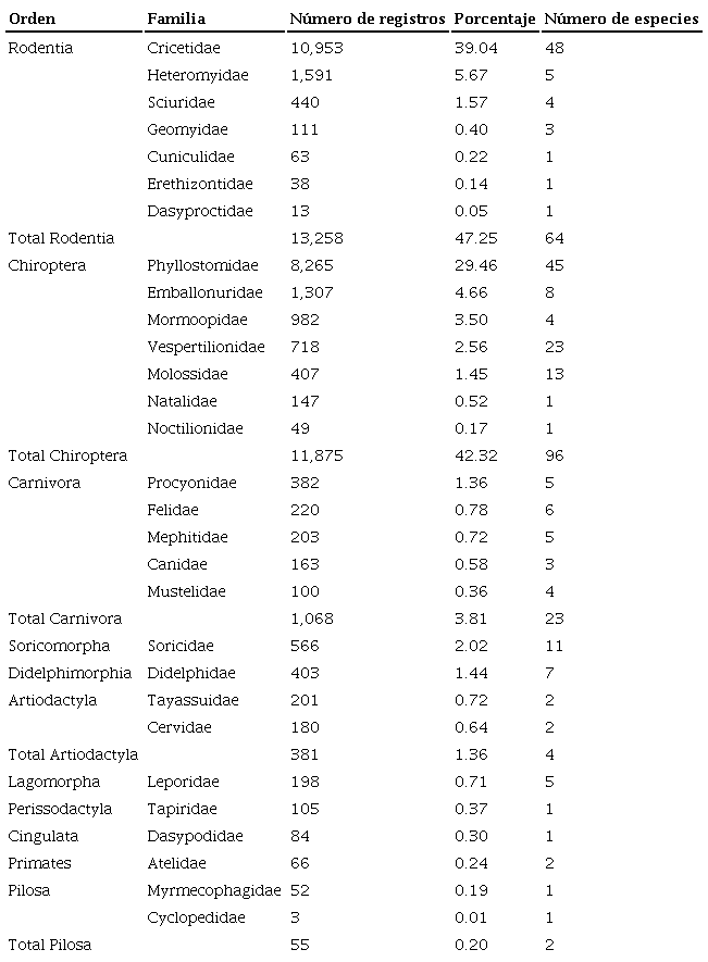 Los órdenes con mayor número de registros son Rodentia con 13,258 registros (47%) y Chiroptera con 11,876 (42%). El orden Pilosa solo estuvo representado por 55 registros (0.2%) (tabla 2). Las familias con mayor número de registros son Cricetidae con 10,953 registros (39%), seguida por Phyllostomidae con 8,265 (29%) y Heteromyidae con 1,591 (6%). La familia con menor representatividad es Cyclopedidae con solo 3 registros, los cuales representan el 0.01% del total.
