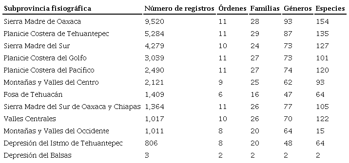 Las subprovincias con la mayor cantidad de registros y más estudiadas son, en orden decreciente: la Sierra Madre de Oaxaca con 9,520 registros (29.43%), la Planicie Costera de Tehuantepec con 5,285 (16.34%) y la Sierra Madre del Sur con 4,279 (13.23%). En cambio, la Depresión del Balsas se encuentra poco estudiada, ya que solo cuenta con 3 registros (tabla 3; fig. 2). El número de especies de mamíferos varió notoriamente en cada una de las subprovincias fisiográficas, desde 154 en la Sierra Madre de Oaxaca hasta 2 en la Depresión del Balsas (tabla 3). En general, la Sierra Madre de Oaxaca, Planicie Costera de Tehuantepec y la Sierra Madre del Sur son las subprovincias que cuentan con la mayor cantidad de especies endémicas y de especies en alguna categoría de riesgo. Por el contrario, las subprovincias que cuentan con la menor cantidad de especies con estas características son la Planicie Costera del Golfo, Fosa de Tehuacán y Depresión del Balsas.