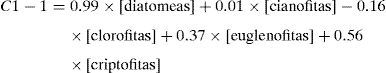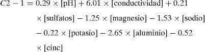 El análisis de correlaciones canónicas realizado considerando como variables dependientes las abundancias de diatomeas, cianófitas, euglenófitas, clorófitas y criptófitas; y como variables independientes a los datos de pH, conductividad, así como las concentraciones de magnesio, sulfatos, sodio, potasio, aluminio y cinc, mostró que la primera correlación canónica fue altamente significativa, con un valor de 0.97 y p = 0.01. La porción de la varianza total de los datos explicada por el primer par de variables canónicas fue del 94%. La construcción del primer par de variables canónicas (C1-1 = dependiente y C2-1 = independiente) en función de los coeficientes canónicos estandarizados de las combinaciones lineales, resultó en las siguientes fórmulas: