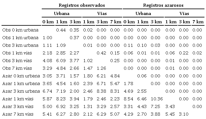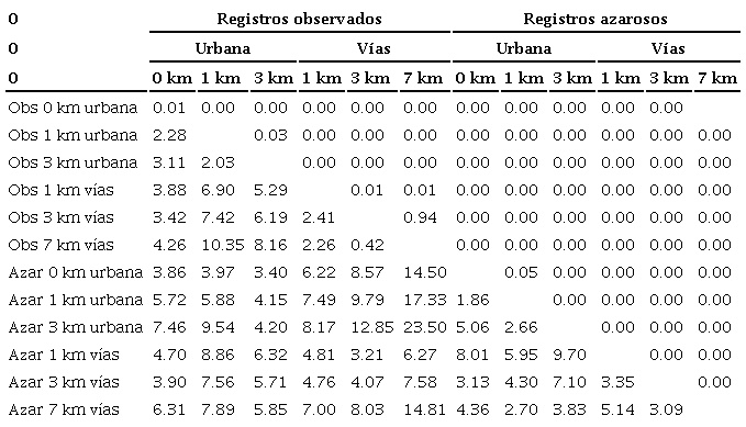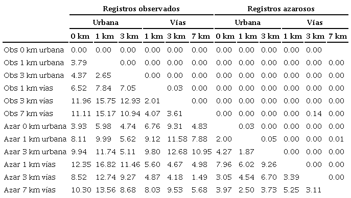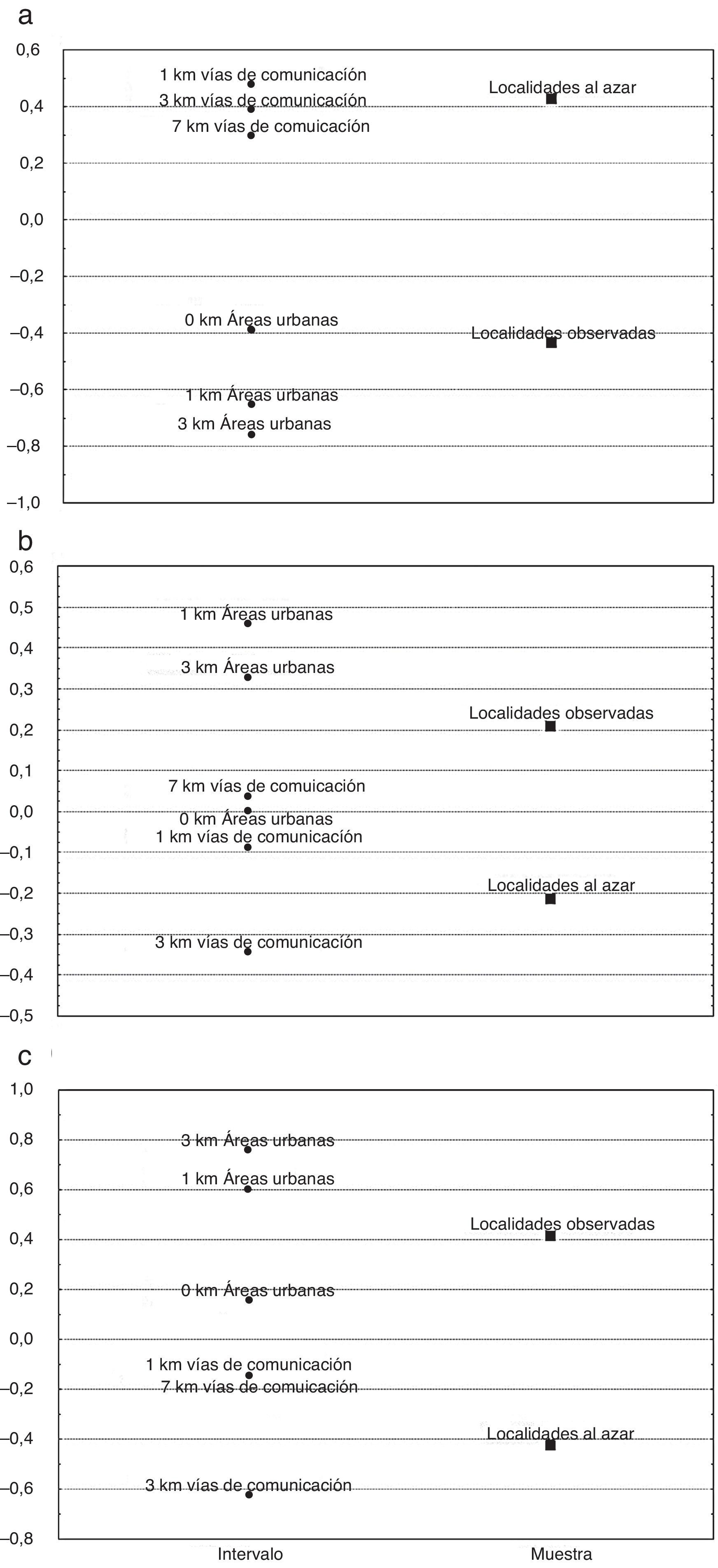 En este estudio se estimó el grado de asociación entre el intervalo de distancia a zonas urbanas-vías de comunicación y el tipo de localidad, ya sea observada o generada al azar. La variable categórica "intervalo de distancia a las zonas urbanas-vías de comunicación" incluyó 6 categorías, 3 representaron la cercanía a las vías de comunicación (a 1, 3 y 7 km) y 3, la cercanía a zonas urbanas (0, 1 y 3 km); mientras que la variable "tipo de localidad" consideró 2 categorías: localidades observadas y localidades generadas al azar. Las localidades generadas al azar fueron las mismas que las utilizadas en la prueba de aleatoriedad. A cada localidad se le asignó una categoría de intervalo de distancia a zonas urbanas-vías de comunicación, dependiendo de la distancia que presentó con respecto a las vías de comunicación-áreas urbanas y al tipo de localidad, ya sea observada o generada al azar. Esta clasificación se utilizó para generar una matriz de contingencia entre la frecuencia de localidades por intervalo de vía de comunicación-zona urbana y el tipo de localidad. A la matriz se le aplicó el análisis de correspondencia para crear un menor número de dimensiones que representan la asociación entre las categorías que componen a las 2 variables categóricas (Gotelli y Ellison, 2004). Las categorías que se encontraron cercanas en la gráfica de dispersión presentaron una mayor asociación (frecuencia) que aquellos pares de categorías que se encontraron distantes. La hipótesis nula a contrastar fue que las frecuencias observadas por intervalo de distancia a zonas urbanas-vías de comunicación fueron similares con respecto a registros obtenidos al azar, con un nivel de significancia de 0.05.