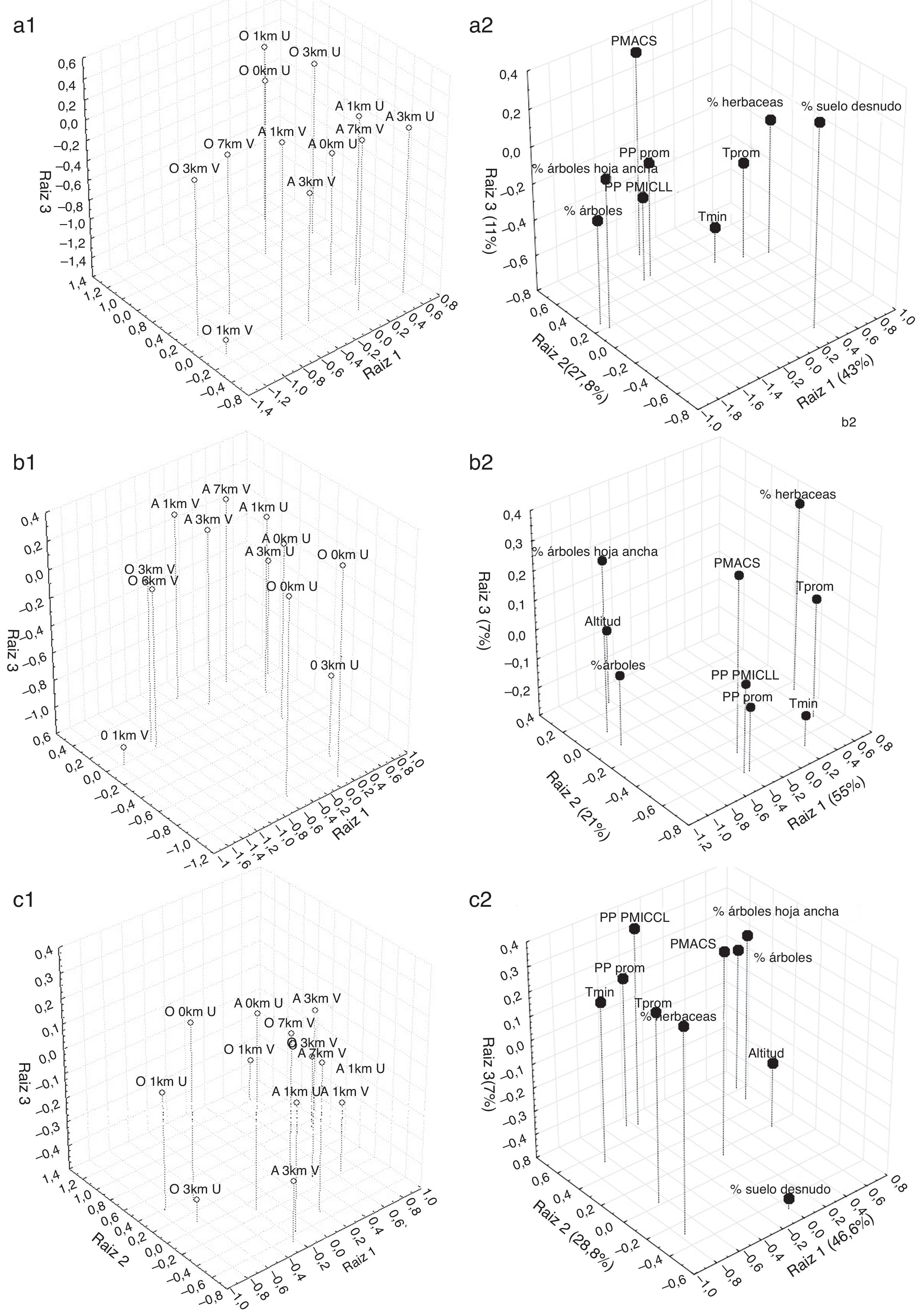Las condiciones ambientales de los registros obtenidos de forma aleatoria, agrupados en los 6 intervalos de distancia a áreas urbanas y vías de comunicación, fueron diferentes, excepto entre los intervalos a 0 y 1 km de las zonas urbanas (tabla 2). Por lo anterior, cada categoría de distancia a vías de comunicación o zonas urbanas refleja una variación ambiental distinta. Las localidades de recolecta de las especies de gastrópodos que se encontraron a una distancia de 0, 1 y 3 km de las zonas urbanas presentaron características ambientales similares, lo cual también ocurrió entre las localidades que se encontraron a 1, 3 y 7 km de las vías de comunicación (lambda de Wilks: 0.6, Fg.l. = 110,6613 = 4.2, p < 0.0000). Los registros cercanos a zonas urbanas se caracterizaron por asociarse a áreas con menos del 15.7% de árboles, de los cuales no más del 20.1% correspondieron a árboles de hoja ancha; con más del 73.7% de herbáceas, bajos porcentajes de suelo desnudo (menores del 9.7%) y una precipitación mayor de los 81.5 mm en el cuatrimestre más seco del año (figura 2a). En contraste, los registros que se encontraron cercanos a las vías de comunicación se caracterizaron por asociarse a más del 15.7% de árboles, de los cuales más del 20.1% correspondieron a árboles de hoja ancha; con menos del 73.7% de herbáceas, altos porcentajes de suelo desnudo (más del 9.7%) y una precipitación menor de los 81.5 mm en el cuatrimestre más seco del año. Las condiciones ambientales menos exploradas para las especies de gastrópodos fueron las que se encontraron en áreas con menos del 15.7% de árboles, de los cuales no más del 20.1% correspondieron a árboles de hoja ancha; con más del 73.7% de herbáceas, porcentajes de suelo desnudo mayores al 9.7% y con una precipitación por debajo de los 81.5 mm en el cuatrimestre más seco (figs. 2a1 y a2).