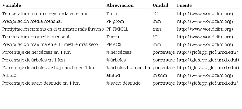 La representatividad ambiental de las localidades de recolecta se estimó comparando las condiciones ambientales asociadas a las localidades observadas con las condiciones ambientales de las localidades generadas al azar. Las localidades se agruparon en los 6 intervalos de distancia a las vías de comunicación y zonas urbanas, tal como se hizo en la prueba de independencia. Las variables ambientales utilizadas para comparar los grupos de localidades fueron climáticas (WorldClim), el porcentaje de cobertura vegetal (Global Land Cover Facility) y la elevación (WorldClim; tabla 1), las cuales presentaron una resolución espacial de 30 arco segundos (≈ 1 km). Las comparaciones se realizaron con el análisis de funciones discriminantes lineales, un análisis multivariado que tiene como objetivo estimar diferencias significativas entre grupos e identificar las variables asociadas a tales diferencias (Legendre y Legendre, 1998). Este análisis es una extensión de la prueba de ANOVA, que maximiza las diferencias entre grupos y minimiza las variaciones dentro de ellos, pero incluye más de una variable independiente (Gotelli y Ellison, 2004). El análisis creó combinaciones lineales de las variables originales, que extrajeron la mayor variación entre los grupos (raíces). El número de raíces generadas fue igual al número de grupos comparados. La interpretación de los resultados se llevó a cabo con las raíces que aportaron variación significativa (prueba sucesiva de la X2) o cuyo valor acumulado aportara, al menos el 75%, de la variación total. La posición promedio de los grupos (centroides) fue graficada en las raíces significativas. Las variables utilizadas para interpretar las diferencias entre grupos fueron las que presentaron el valor de la estructura de factores mayor de 0.6 o menor de -0.6. El valor de la estructura de factores refleja la correlación existente entre el valor de las variables originales con respecto a los nuevas variables generadas (raíces). Por último, se determinó entre qué pares de grupos de localidades se presentaron diferencias significativas con un nivel de significancia de 0.05.
