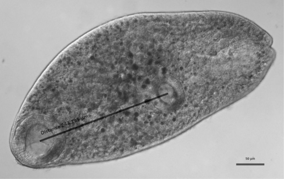 The metacercariae were oval (462 ± 104 × 208 ± 42 μm) with spinosed tegument; oral sucker sub apical (93 ± 17 μm) and acetabulum post equatorial (66 ± 12 μm diameter); pharynx lightly oval (47 ± 10 × 42 ± 10 μm) and intestinal ceca ending blindly and extended to the half 1/3 the posterior end of the body, the excretory vesicle was Y shaped forming 2 collecting tubes reaching the pharynx and the distance between the oral sucker and the acetabulum was 249.19 μm (Figs. 1 and 2): it was not possible to observe other structures.