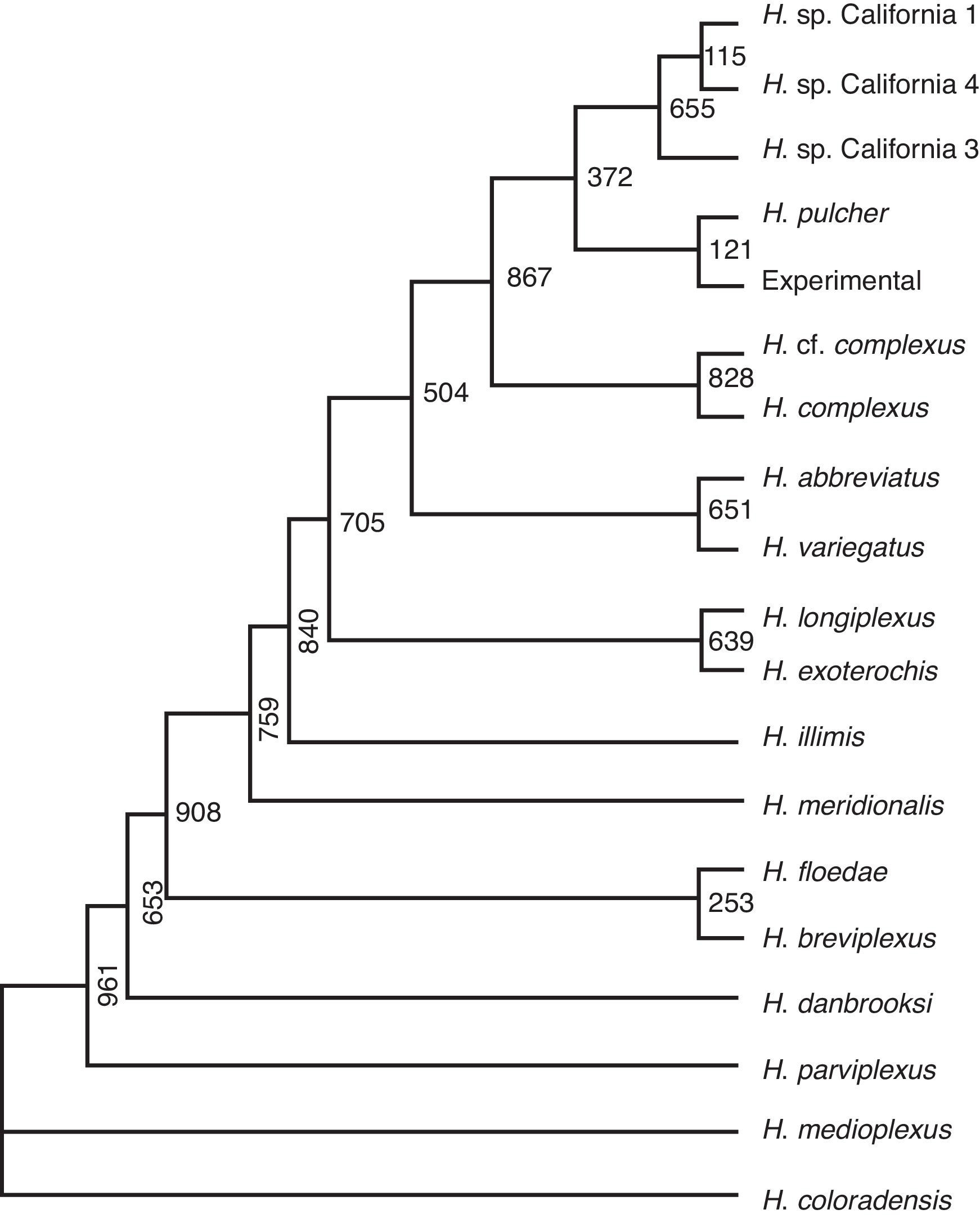 The blast analysis revealed a 99% identity (457/461) with Haematoloechus pulcher. The Fig. 3 shows the maximum likelihood phylogram tree generated. The phylogenetic relationship among the experimental and H. pulcher sequence confirm the identification. The phenogram showed 2 main branches. In the upper branch are clustered the California, experimental, H. pulcher, H. complexus H. variegatus, H. abbbreviatus , H. exoterorchis and H. longiplexus.