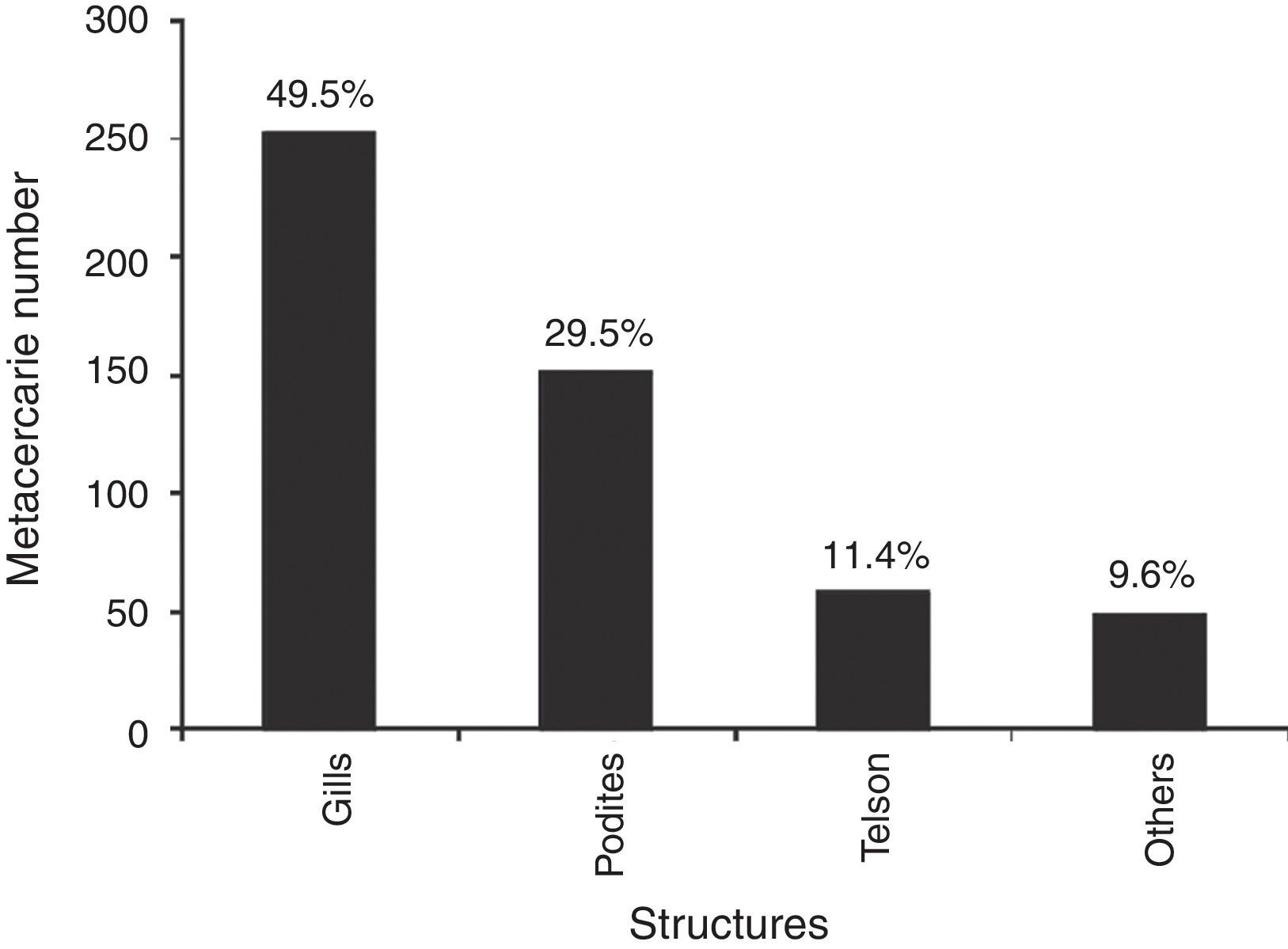 The prevalence of the metacercariae in crayfish was 42.5% (94/221). The maximum intensity of metacercariae (26) was recorded in a male crayfish with a size of 25.7 mm, collected in September 2008. The metacercarie were located mainly in the gills, podites and telson. Other anatomical units include: front, exoskeleton and internal organs (Fig. 4). The average intensity was 6 metacercariae by crayfish in both sexes. Metacercarie abundance was higher in females (2.6%) than in males (2.4%), however, the difference was not significant (U -Mann-Whitney p = 0.93). The sizes of crayfish analyzed ranged from 11.4 to 35 mm of length. The size at which the presence of parasites was detected in females was 13.94 mm, furthermore, an alteration in the intensity of infestation by cohorts was found. The parasite number in females increased gradually with size up to 32 mm (Fig. 5a). The male size range was 11.76-30.49 mm. The smallest parasitized specimen was 13.78 mm and the peek intensity of parasites was found in the size class from 26 to 30 mm of length (Fig. 5b).