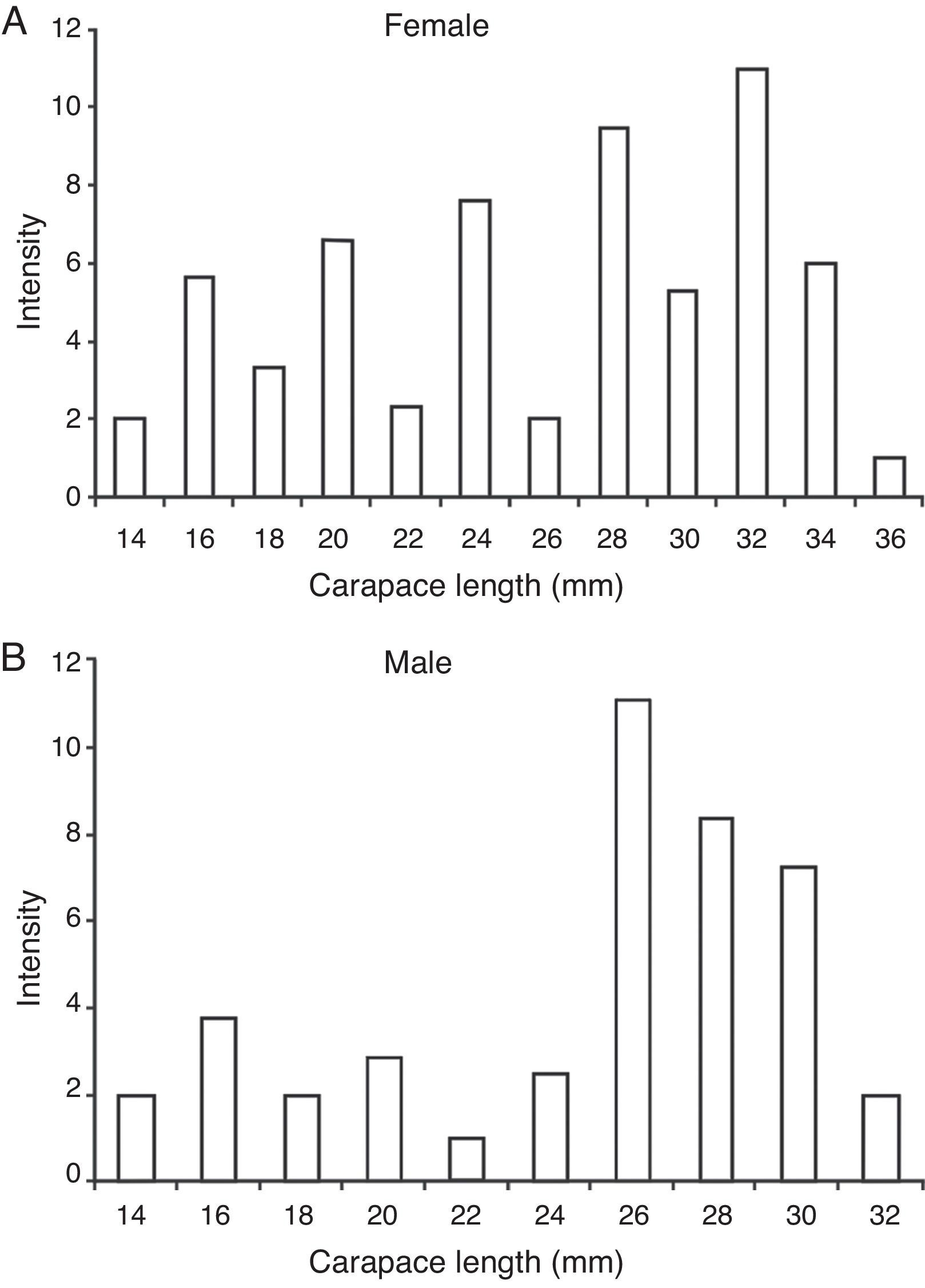 The direct relation between an increase of parasite intensity and the size of crayfish may be related to the body bulk "available" for the metacercariae, indeed, individuals with a total length smaller than 13.8 mm showed no metarcercariae, but an accumulation over time.