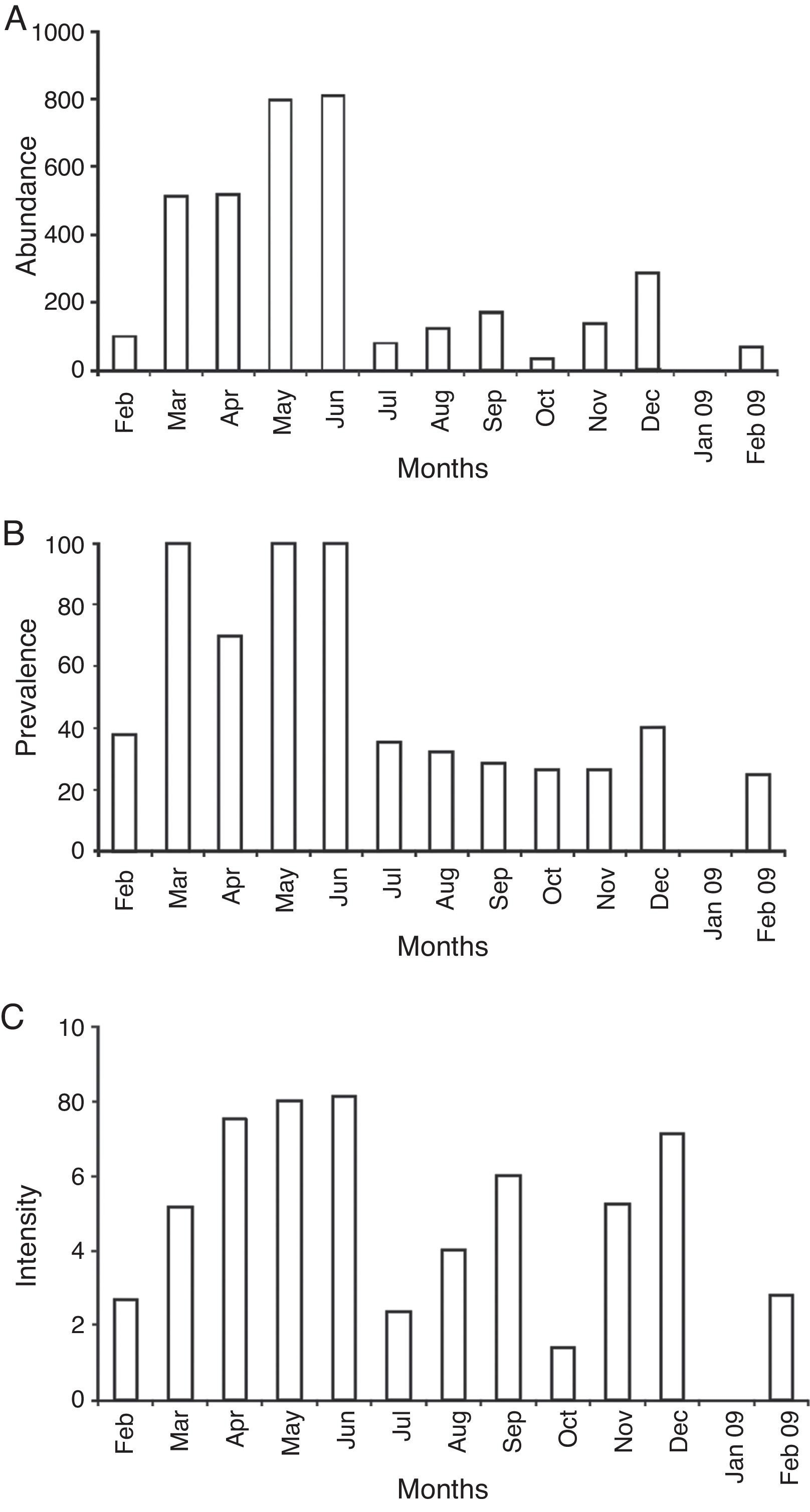 Both male and female crayfish were parasitized throughout the year (except January) (Fig. 6). The abundance of metacercariae per crayfish was higher from March to June (Fig. 6a). The prevalence was higher from March to June (Fig. 6b). This results in a potentially active and ongoing infection. The average of the intensity increased from February to June (Fig. 6c).
