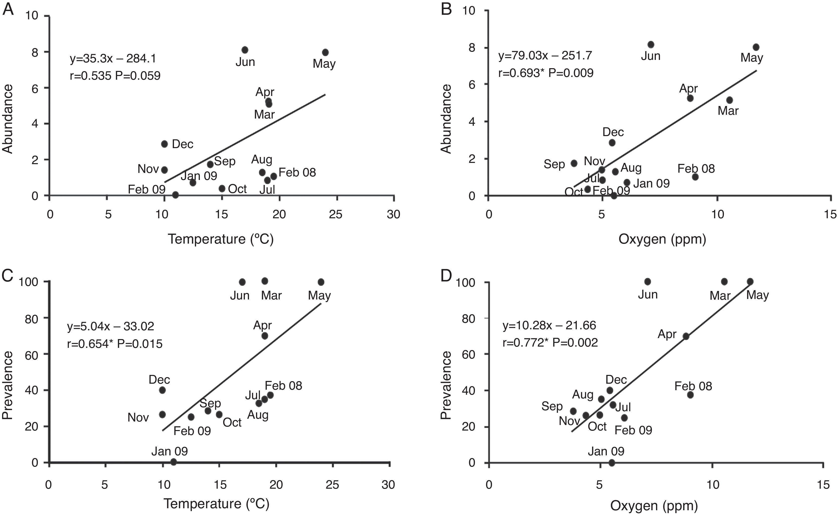 The abiotic factors recorded were as follows: the water temperature ranged from 10 °C in November and December, to 24 °C in May (at 15 h), with a global average of 16 °C. The pH ranged from 5 (December 2008) to 9.3 (February 2010), the average being 6.4. On the other hand, the oxygen concentration range was 4.4 mg/l (October) to 11.7 mg/l (May) with an average of 6.75 mg/l. The minimum transparency was 1.1 m (August and September) and the maximum was 3.67 m (February 2009). The catch per unit effort (CPUE) ranged from 3.5 (June and July) to 45 (August), with an average of 12 crayfish per sampling unit. The increase in the number of metacercariae in crayfish was related to the increase in temperature (Fig. 7a and c) and concentration of dissolved oxygen in water (Fig. 7b and d), present in warmer months (March to June). The correlation between temperature and abundance was not significant at 95% confidence level (p = 0.059).