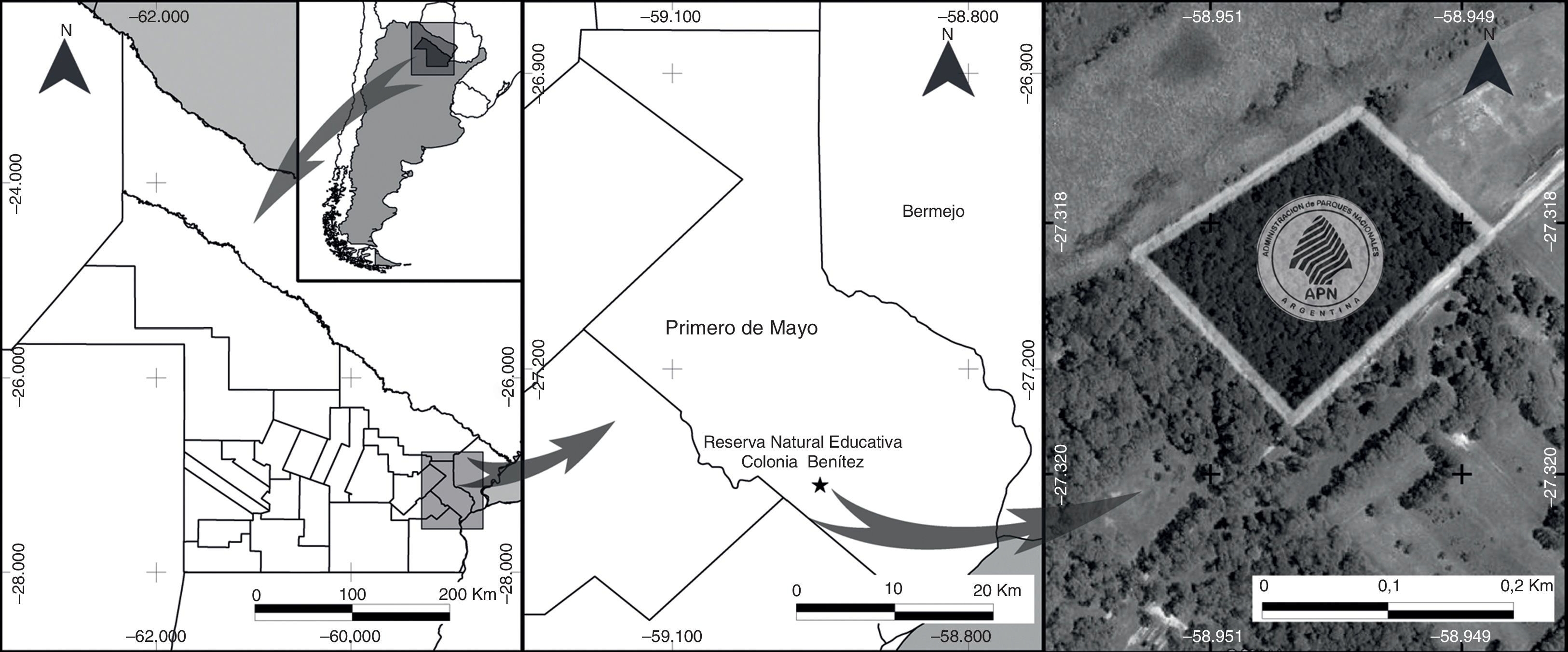 Los muestreos se efectuaron en la RNECB (27°19'04" S, 58°57'00" O), departamento Primero de Mayo de la provincia del Chaco, Argentina (fig. 1). La RNECB se encuentra a 64 m de altitud, el clima es subtropical con un promedio de precipitación anual de 1,300 mm y una temperatura mínima promedio de 19 °C y máxima de 35 °C (Bruniard, 1999). Es parte de la terraza fluvial del valle del río Paraná, la pendiente es escasa y presenta algunos problemas de drenaje. Desde el punto de vista biogeográfico el área está situada en la región Neotropical, subregión Chaqueña, en el sector del Chaco Oriental o Chaco Húmedo (Ginzburg y Adámoli, 2006). A pesar de su tamaño tan reducido (7 ha), incluye una alta riqueza de alrededor de 280 especies de plantas (Ginzburg y Adámoli, 2006). Entre sus formaciones vegetales se distingue el bosque con dominio de Schinopsis balansae (quebracho) y la selva en galería, en la que se reconocen Holocalyx balansae (ibirá pepé), Enterolobium contortisiliqum (timbó), Ficus monckii (ibapoí), Phytolacca dioica (ombú), Peltophorum dubium (ibirá pitá) y Syagrus romanzoffiana (palmera pindó) (Chebez, 2005).